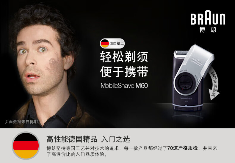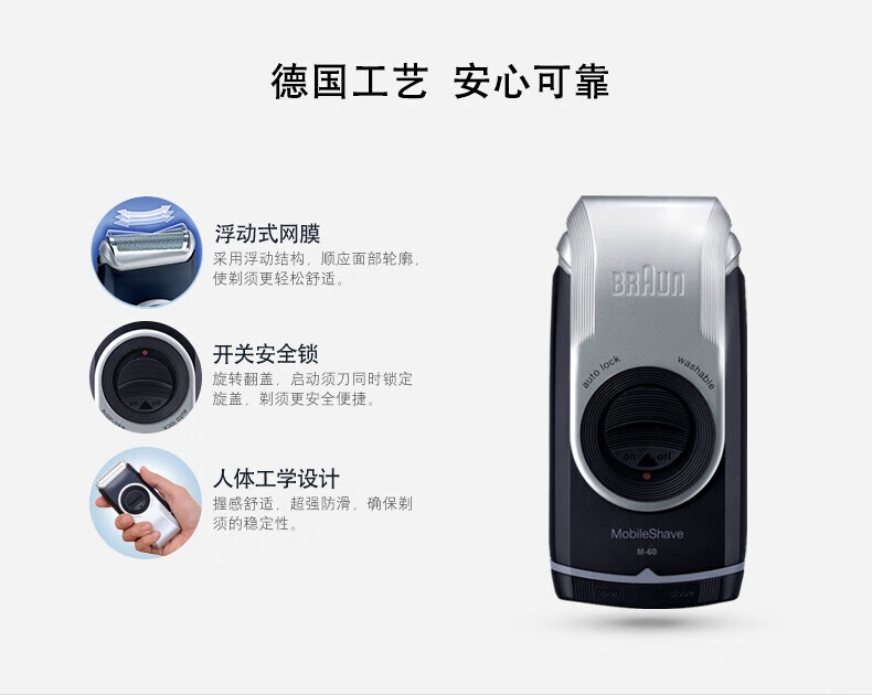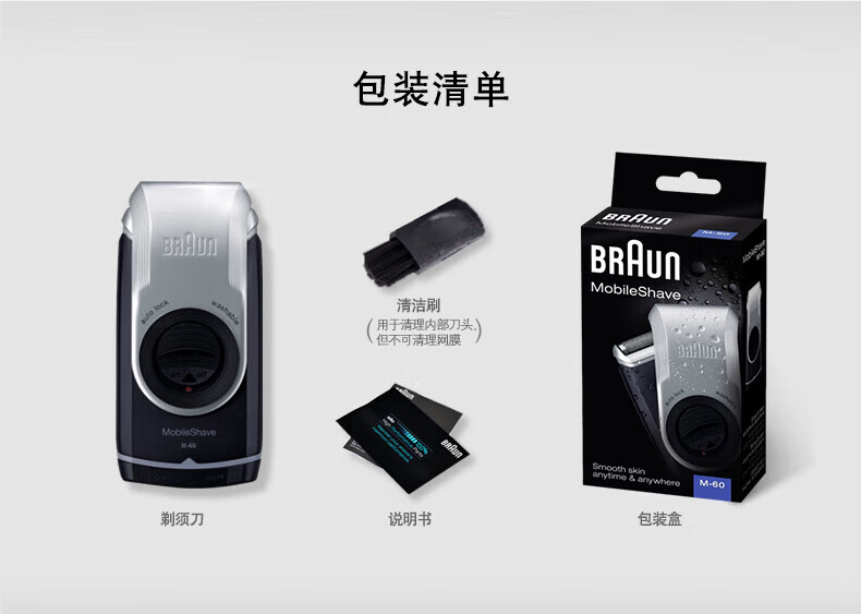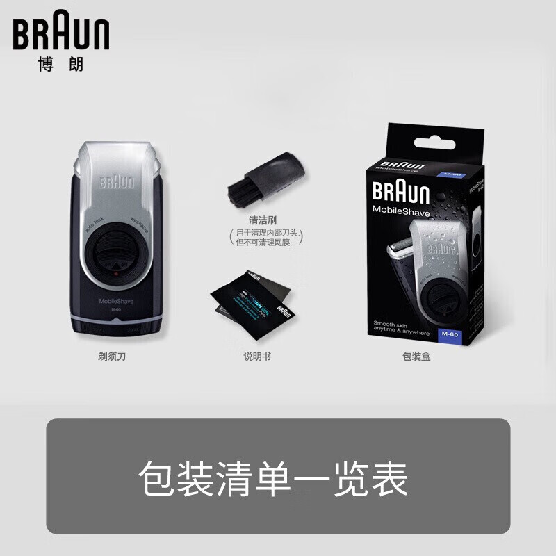 商品名称: 博朗(BRAUN)迷你全身水洗电动剃须刀M60 往复式刮胡刀男士生日礼物 男送老公差旅便携复古便携 M60/个