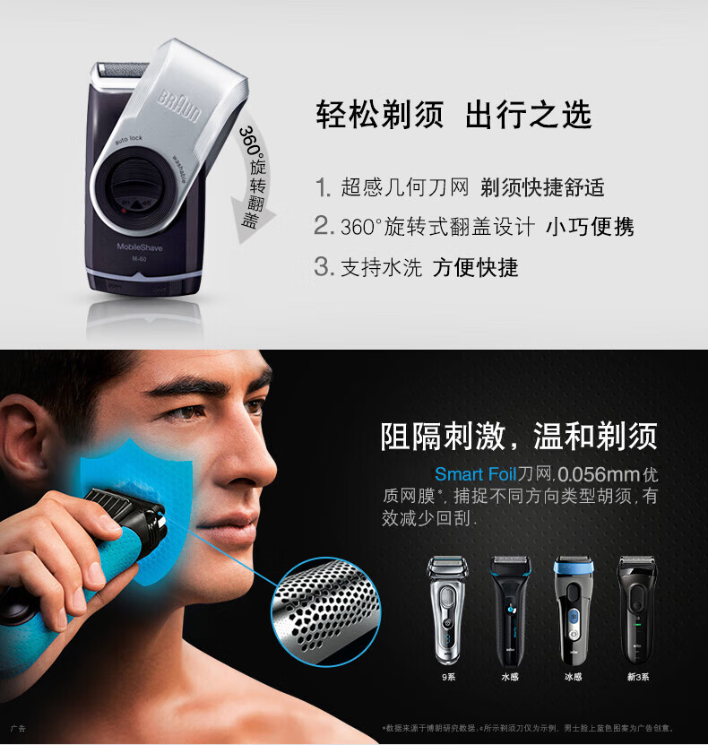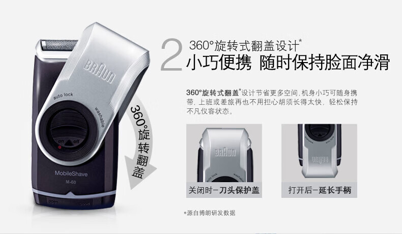 • 商品名称:博朗(BRAUN)迷你全身水洗电动剃须刀M60 往复式刮胡刀男士生日礼物 男送老公差旅便携复古便携 M60/个