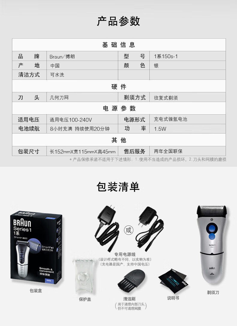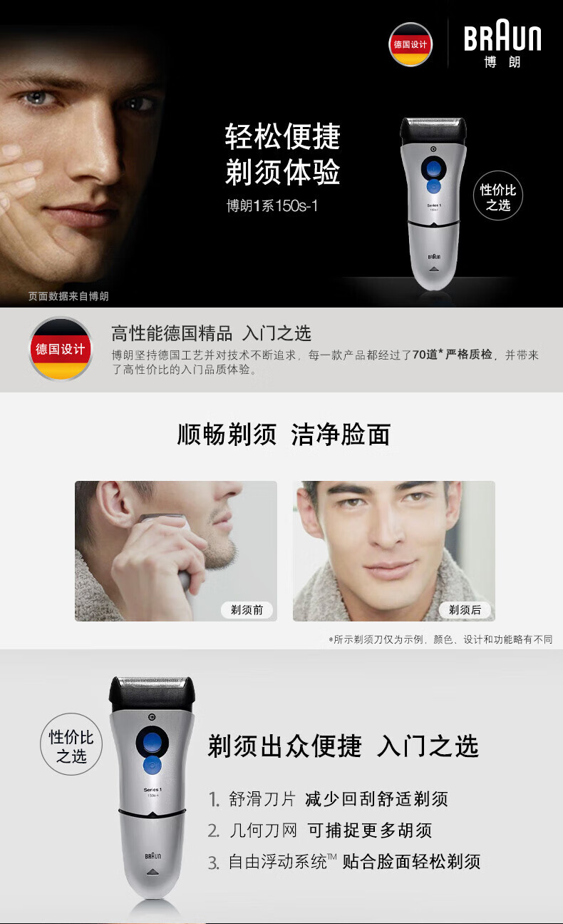 家用电器  > 个护健康  > 剃须刀  >  博朗/BRAUN  >  博朗(BRAUN) 电动剃须刀 电动刮胡刀往复式胡须刀单刀头1系150s-1 150s-1/个