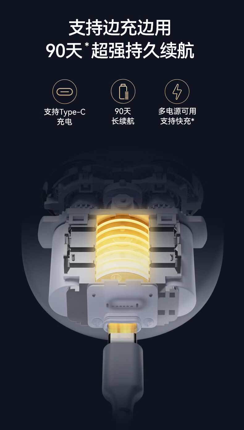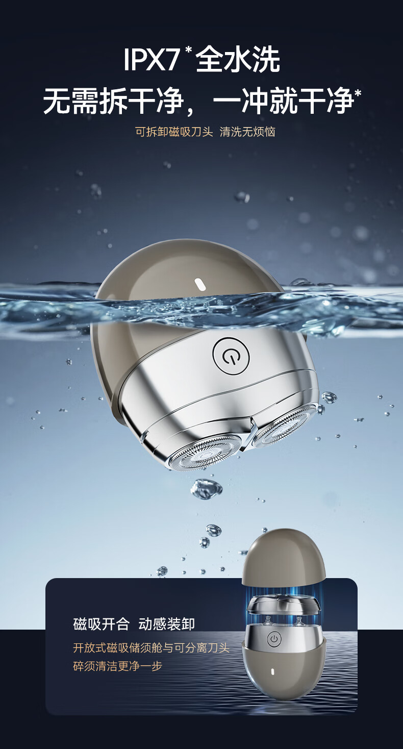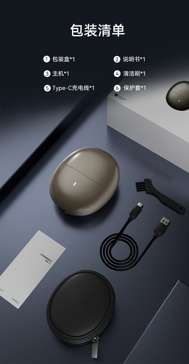 包装清单: 剃须刀主机*1、包装盒*1、清洁刷*1、Type-C充电线*1、说明书保修卡*1,合格证*1,保护套*1