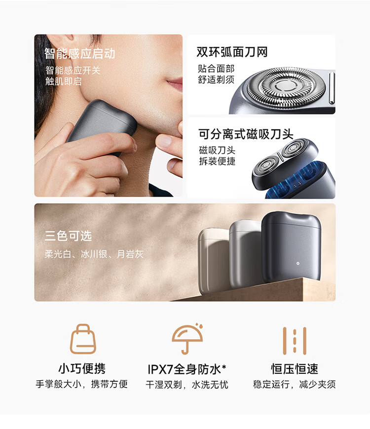 • 商品名称:米家电动剃须刀S200小米刮胡刀小巧便携迷你mini 智能感应剃须磁吸刀头送男友新年礼物推荐 冰川银 S200/台