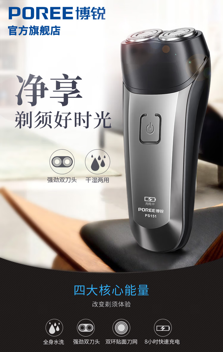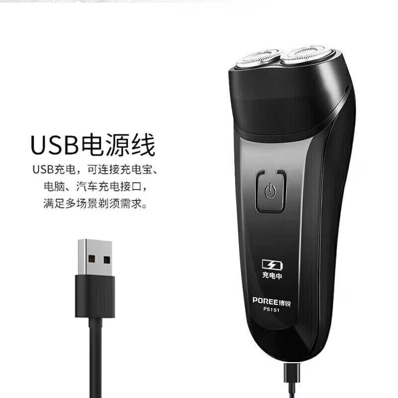 飞科(FLYCO)旗下博锐剃须刀电动刮胡刀 双刀头 小巧便携 充电式全身水洗智能剃胡刀 PS151 +2刀头 PS151/个