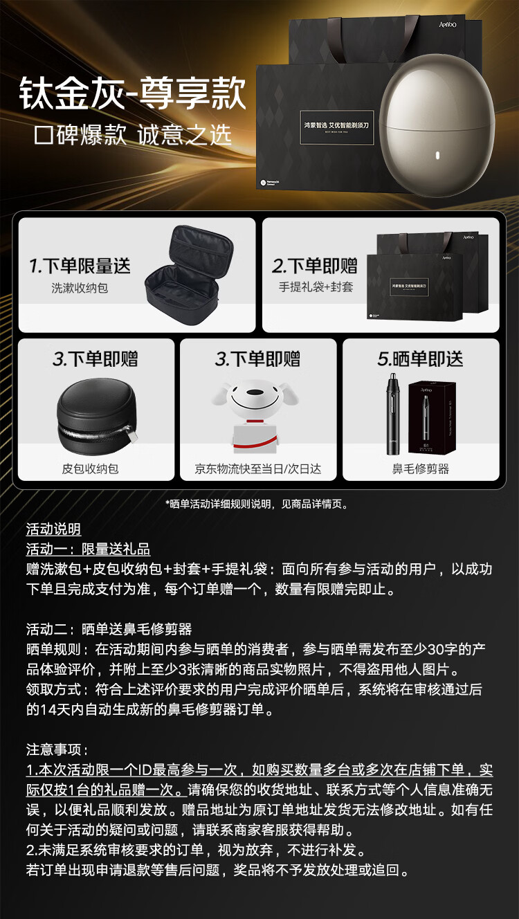 • 商品名称:华为智选鸿蒙智选艾优智能剃须刀【尊享款】高端礼盒男士电动便携迷你刮胡差旅成人生日礼物新年礼物送男友 H1/台