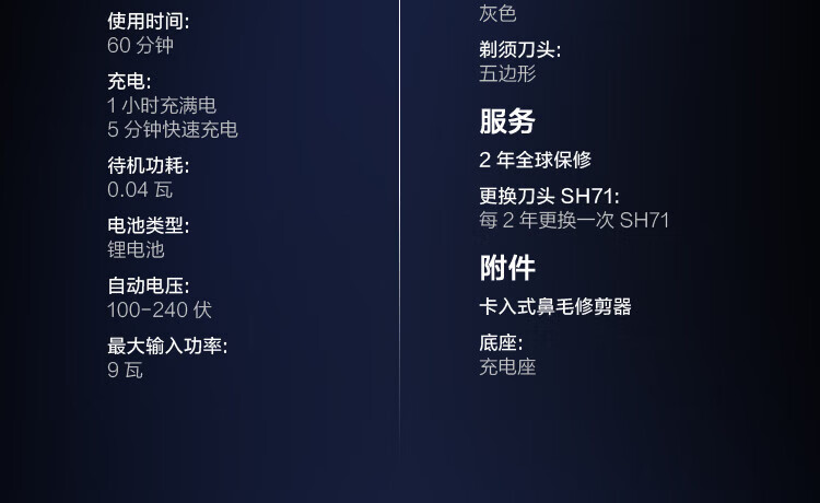 包装清单: 剃须刀主机*1,保护盖*1,充电线*1,卡入式鼻毛修剪器*1,充电座*1