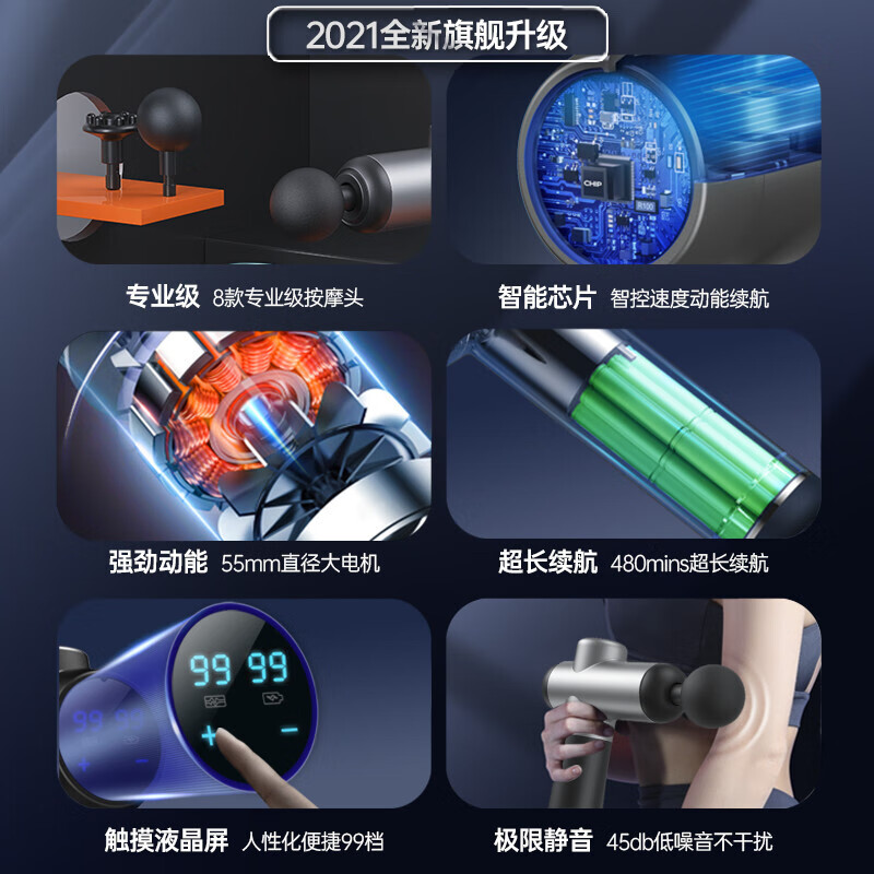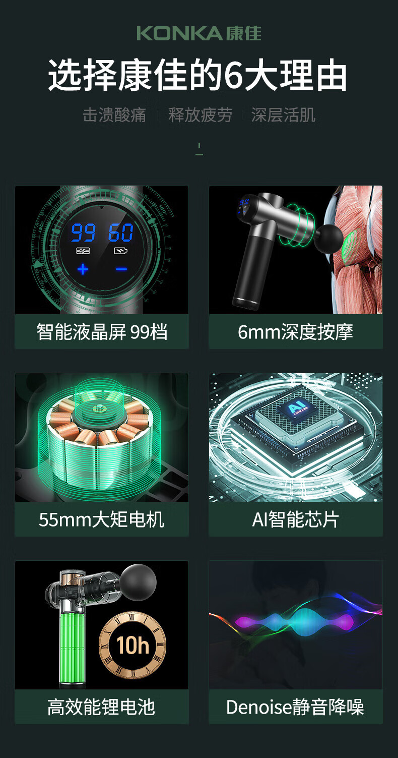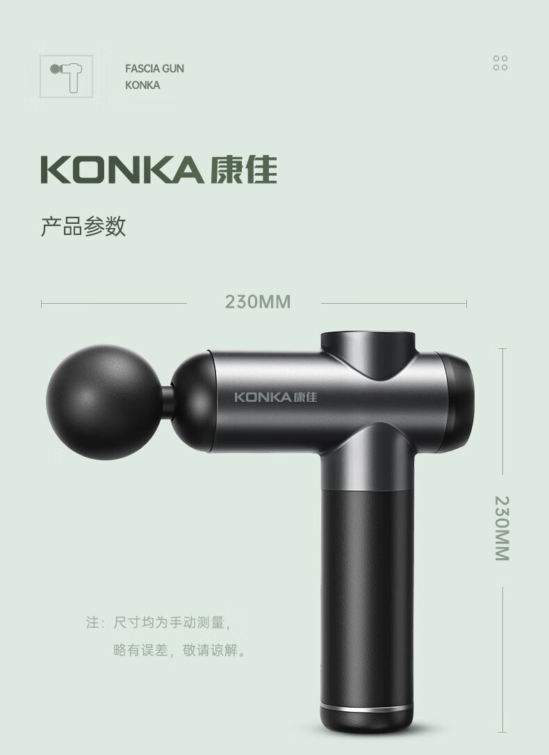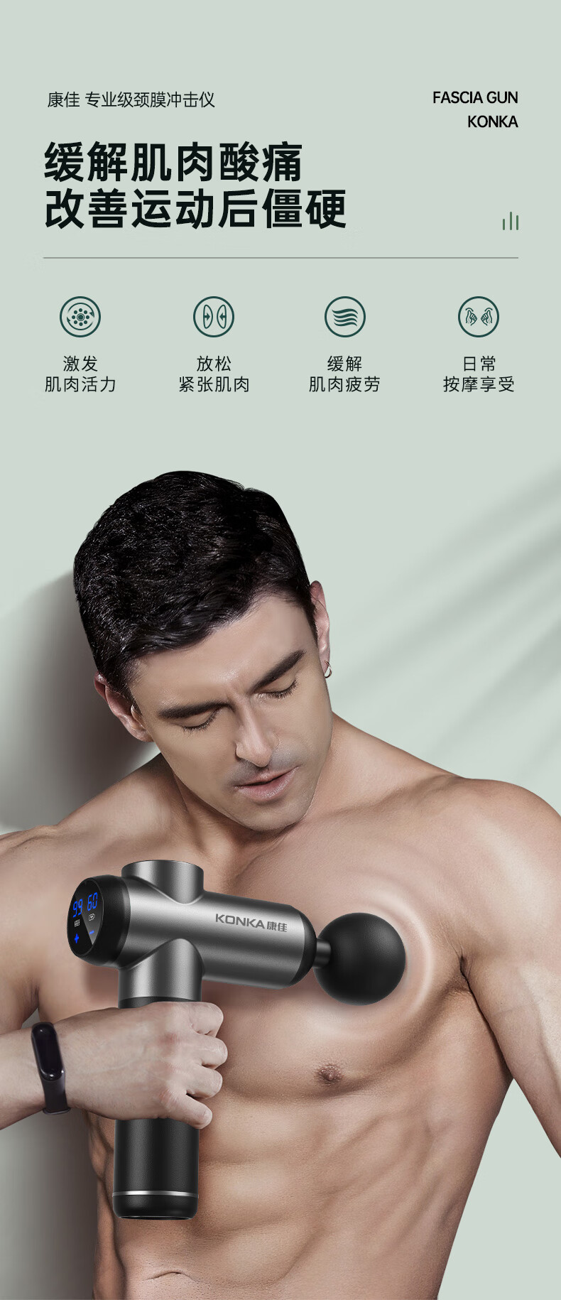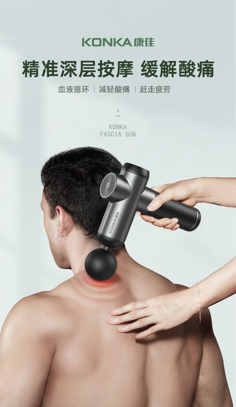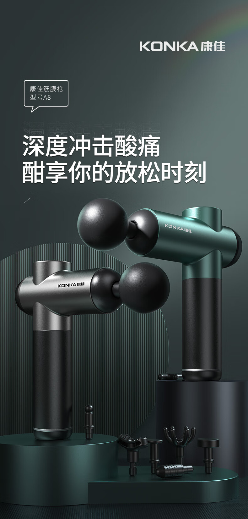 • 商品名称:康佳(KONKA)筋膜枪 颈膜枪 深层肌肉放松按摩器 3秒环节酸痛 A8-2灰色 豪华版:99档+8头按摩头+收纳包 a8/个