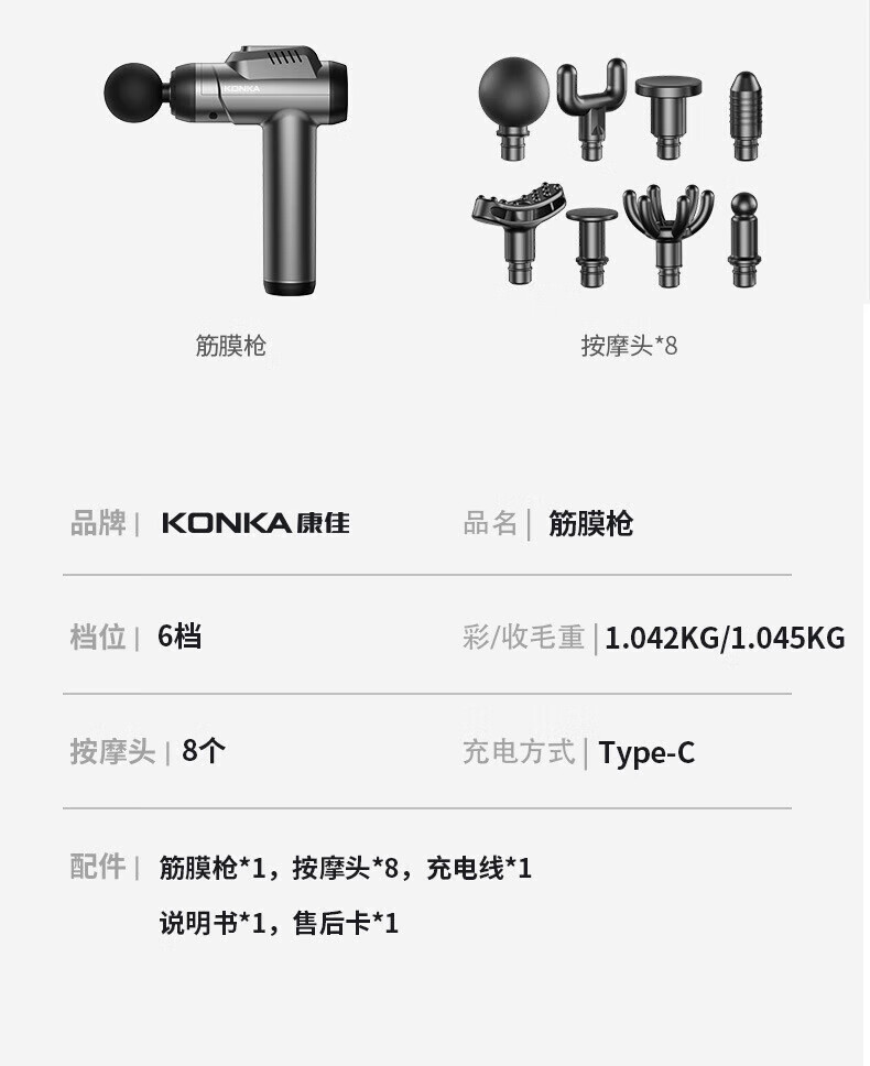 商品名称: 康佳(KONKA)筋膜枪 振动肌肉放松按摩枪 家用运动震动健身腿部电动筋膜枪 A2灰色 99档+8头+液晶屏+收纳盒 A2/台