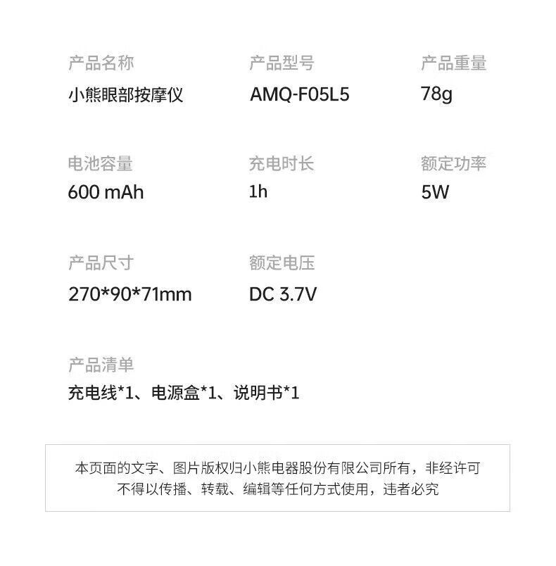 商品名称: 小熊(Bear)眼部按摩仪 护眼仪热敷发热眼罩眼部按摩器睡眠神器 七夕情人节礼物送男女友送父母 AMQ-F05L5 AMQ-F05L5/个