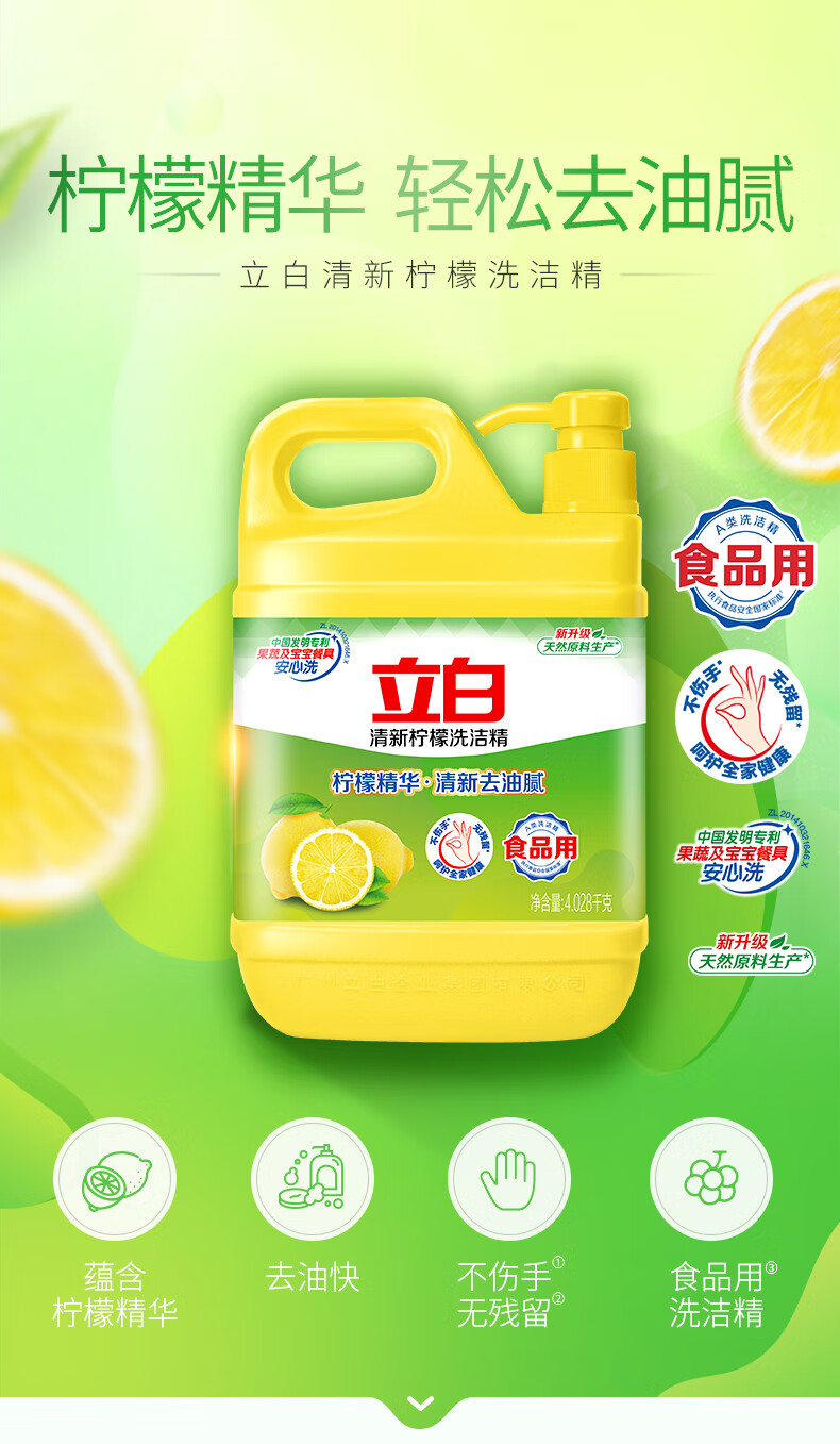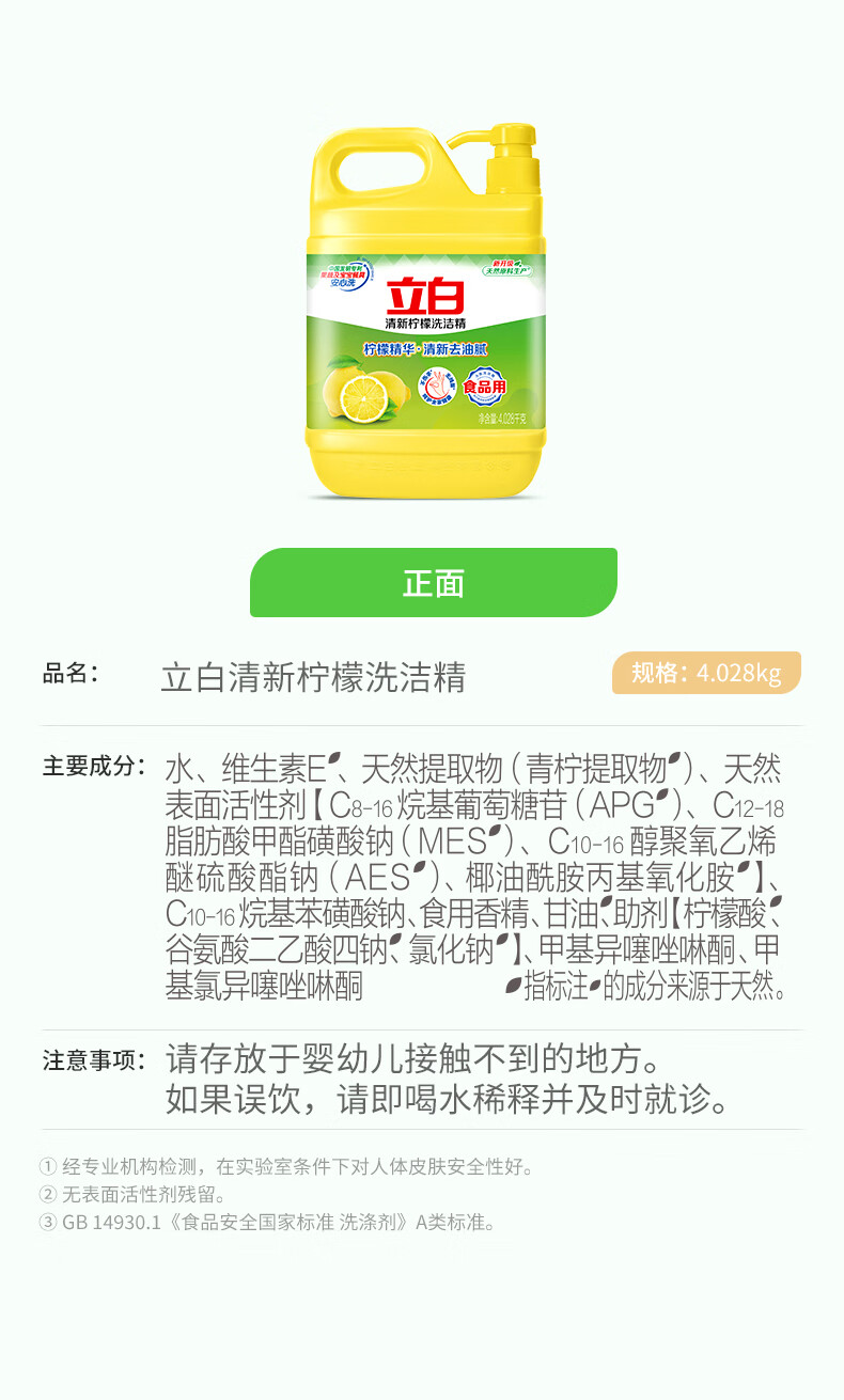 商品名称: 立白洗洁精清新柠檬强效去油不伤手 A类食品用 餐馆酒店大桶装4.028kg 立白柠檬精4.028kg/瓶