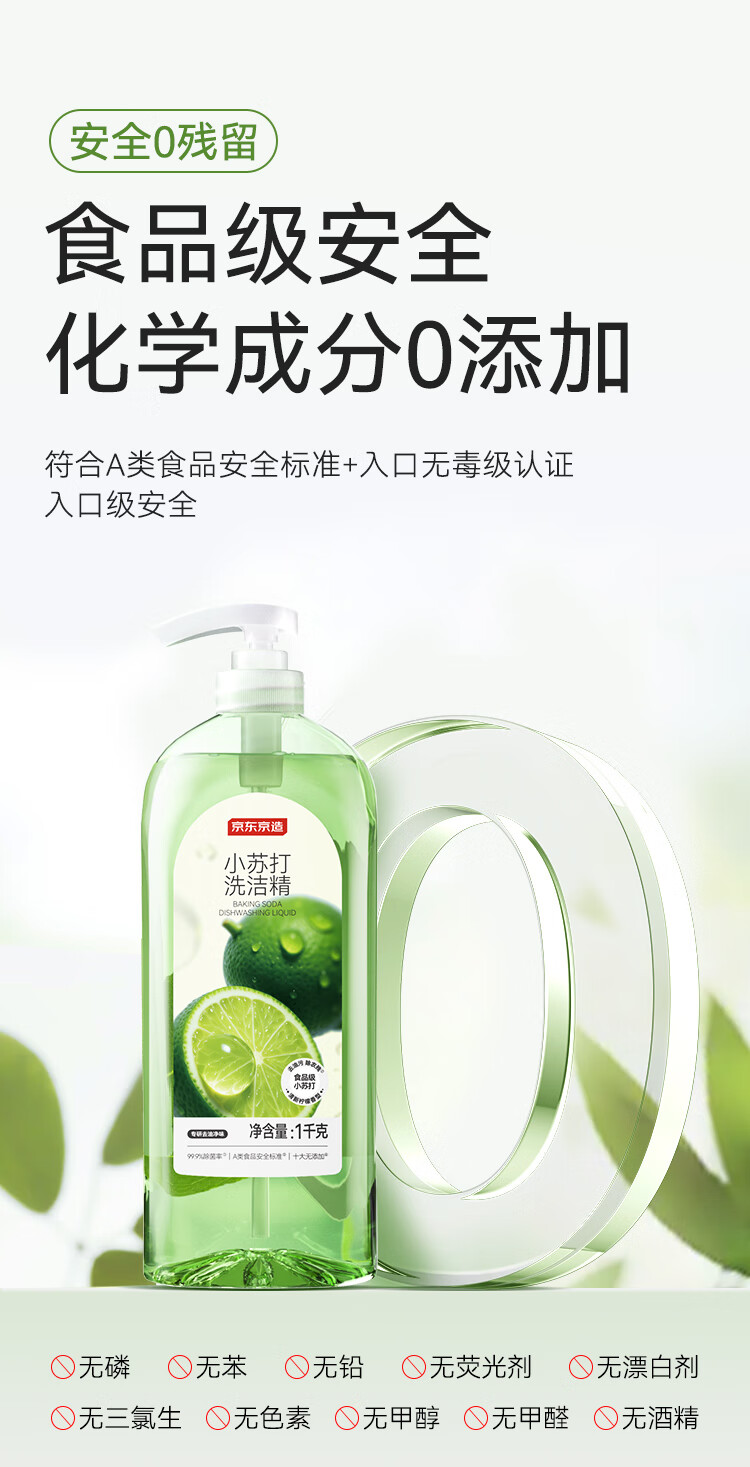 京东京造柠檬小苏打洗洁精1KG*3瓶 A类家用0添加食品级孕婴 去油污洗涤灵 0/箱