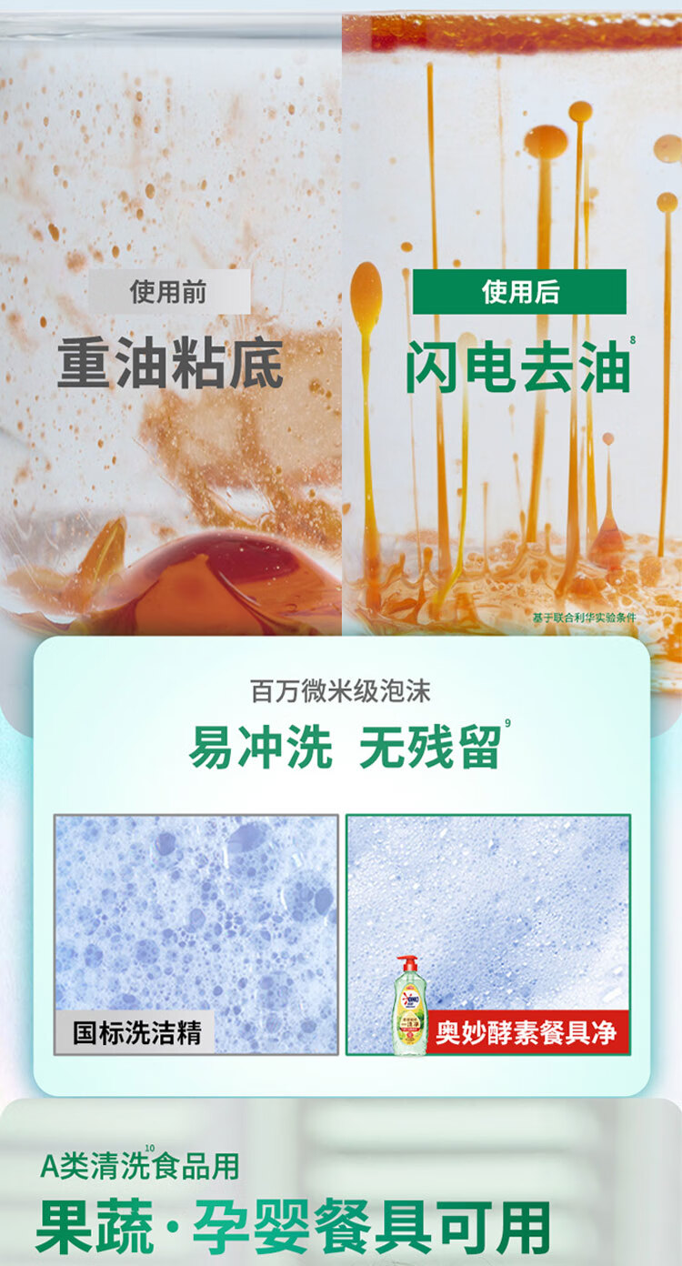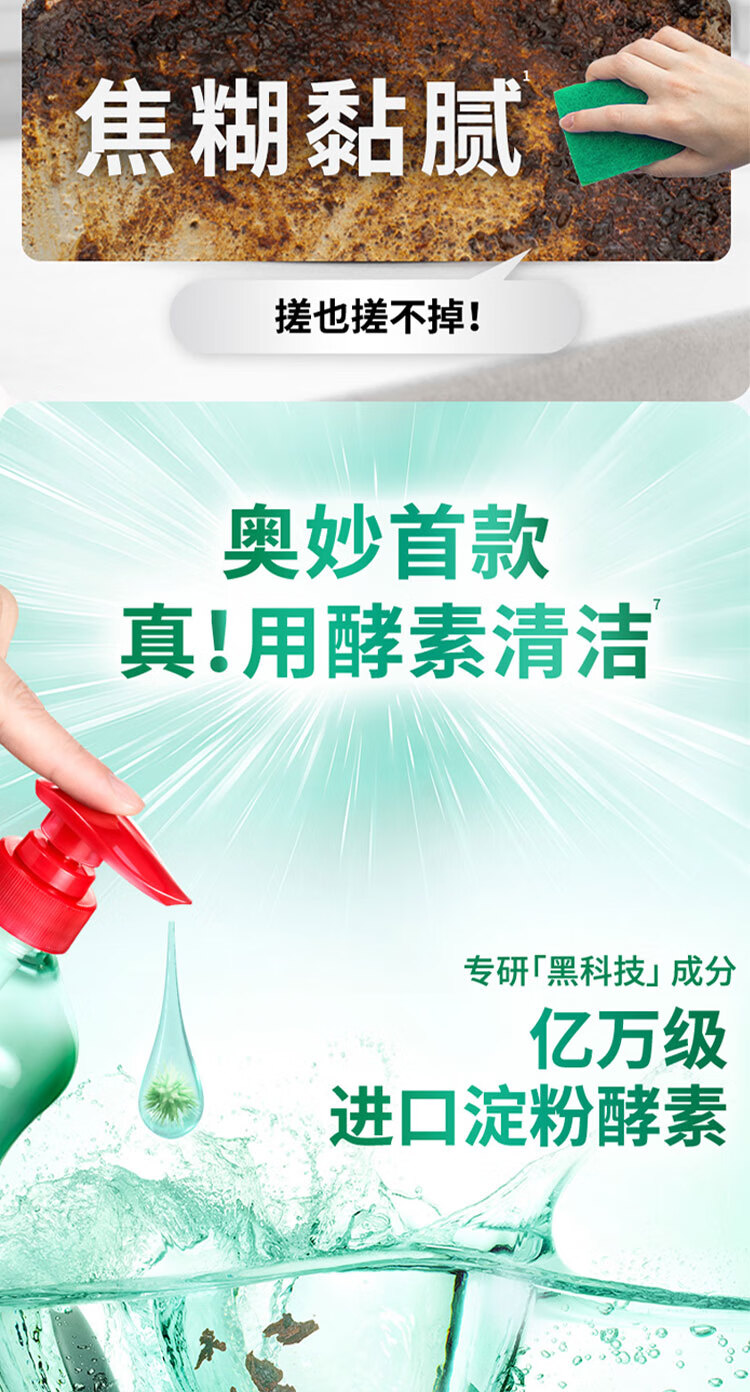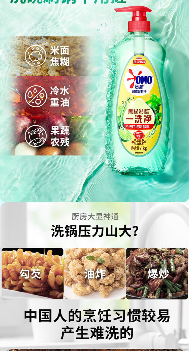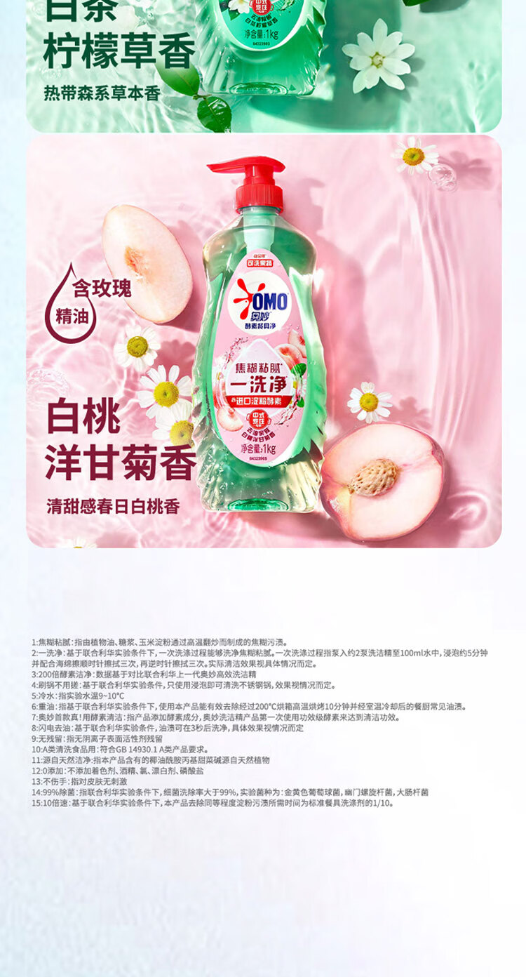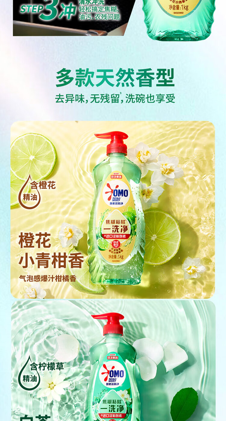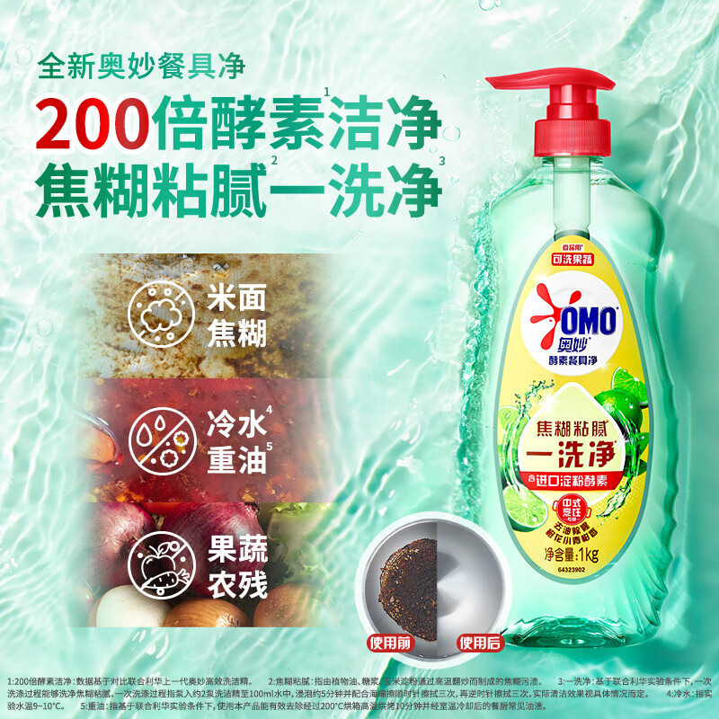 家庭清洁/纸品  > 家庭环境清洁  > 洗洁精  >  奥妙/OMO  >  奥妙大桶酵素餐具净洗洁精 橙花小青柑 1kg*2 4斤装 1泵1补去锅具焦糊 洗洁精/瓶