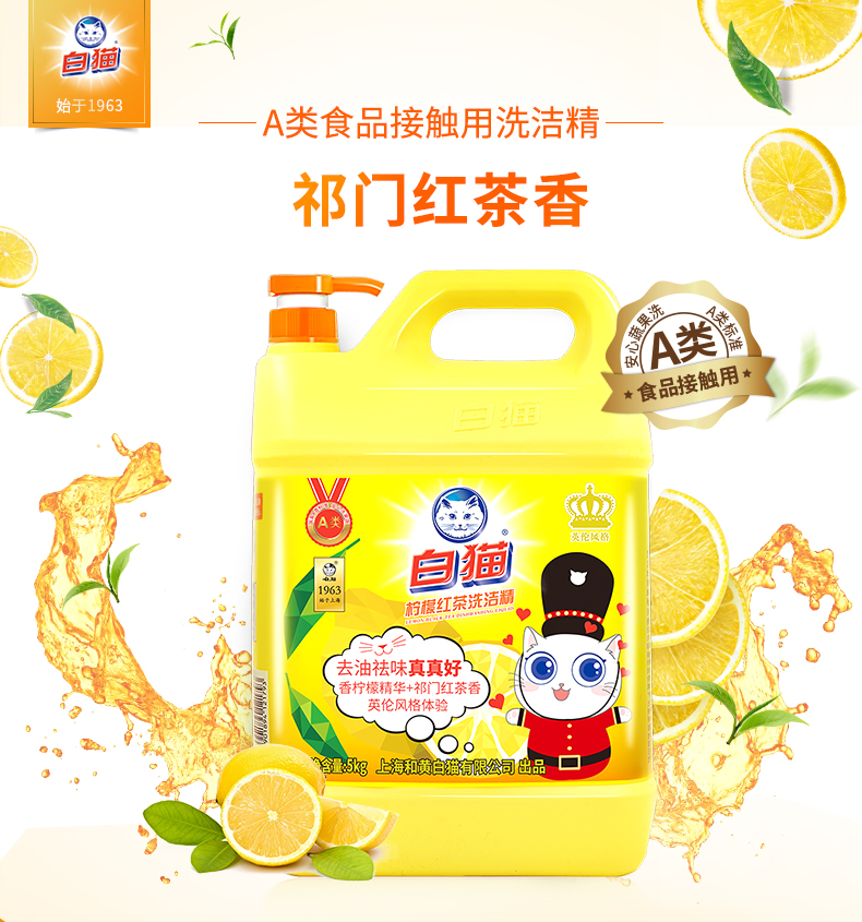 家庭清洁/纸品  > 家庭环境清洁  > 洗洁精  >  白猫  >  白猫 柠檬红茶洗洁精5kg A类去油祛味柠檬红茶香 大桶洗洁精 去油 护手/桶