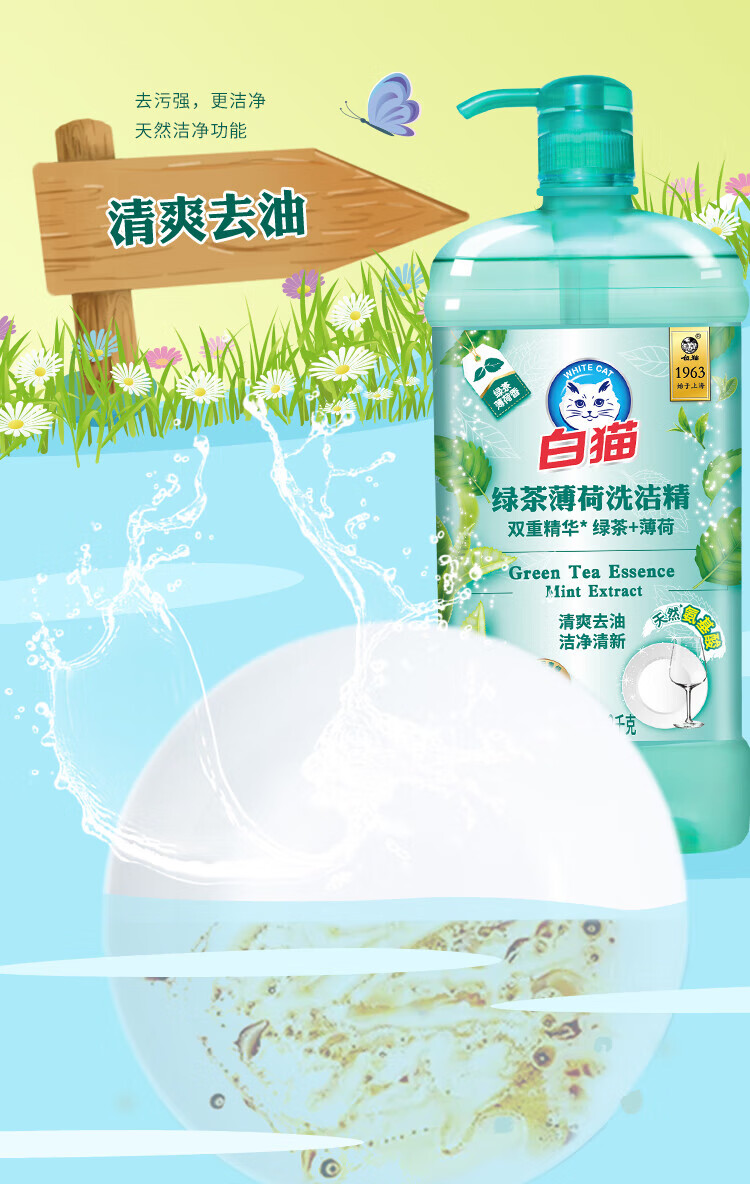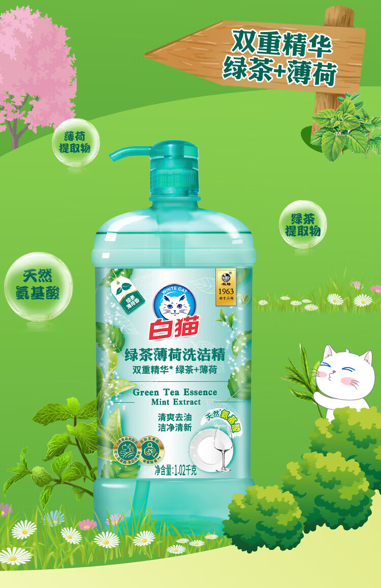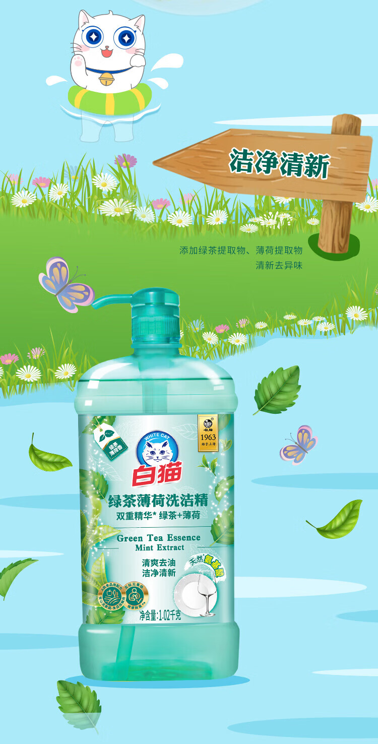 家庭清洁/纸品  > 家庭环境清洁  > 洗洁精  >  白猫  >  白猫绿茶薄荷洗洁精1.02kg 1.02kg/瓶