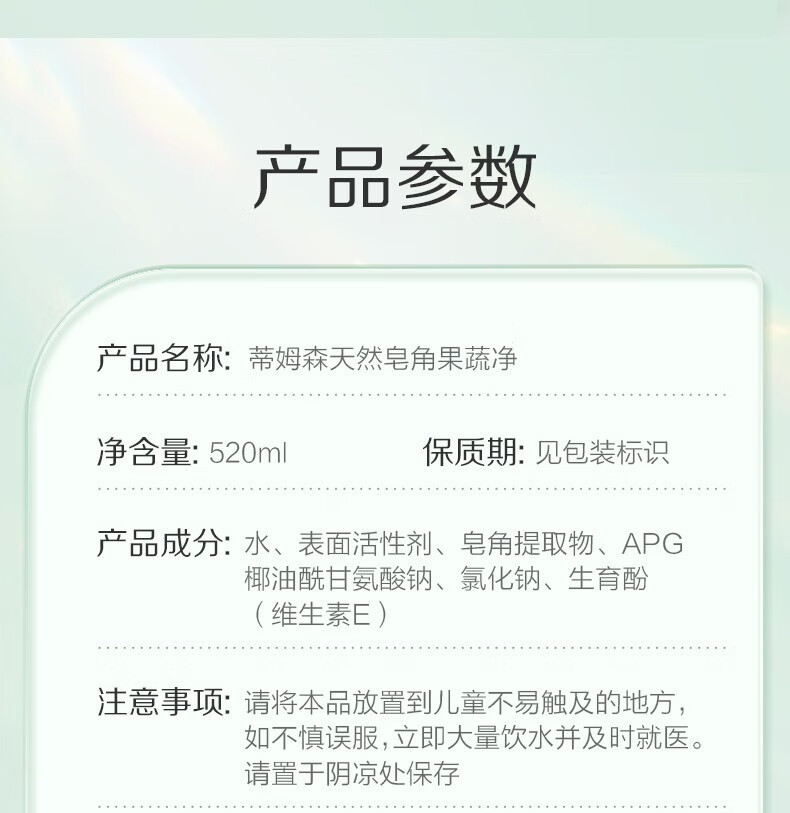 家庭清洁/纸品  > 家庭环境清洁  > 洗洁精  >  蒂姆森  >  蒂姆森天然皂角果蔬净520ml 520ml/瓶
