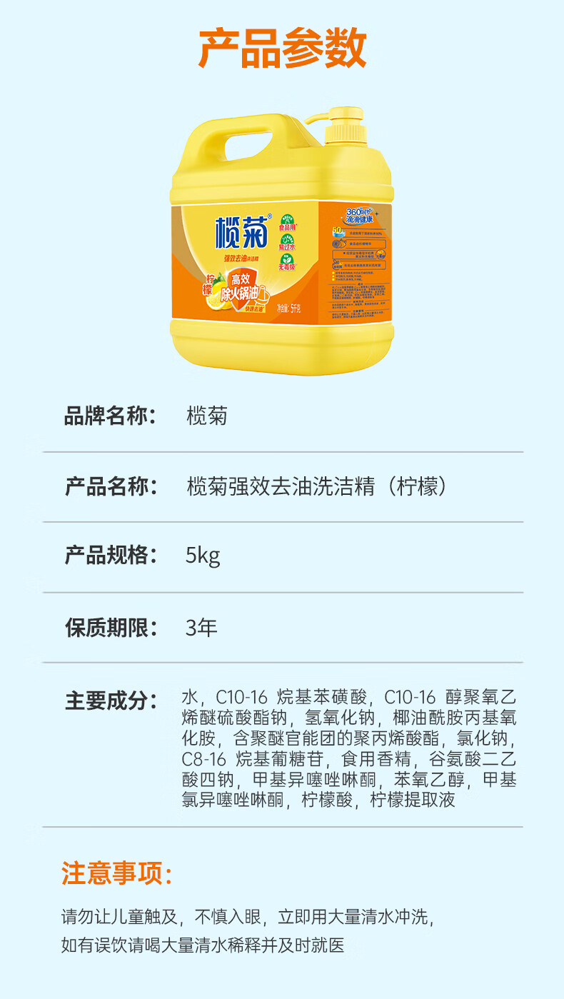 包装清单: 菊之语柠檬洗洁精5kg*1