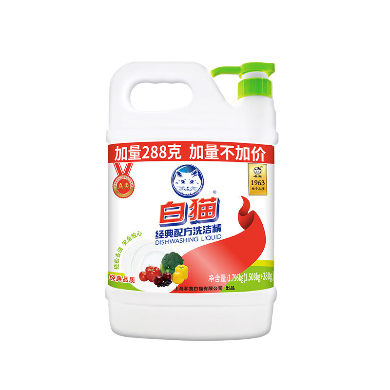 家庭清洁/纸品  > 家庭环境清洁  > 洗洁精  >  白猫  >  白猫经典洗洁精1.796kg(1.506千克+290克) 1.506千克+290克/瓶