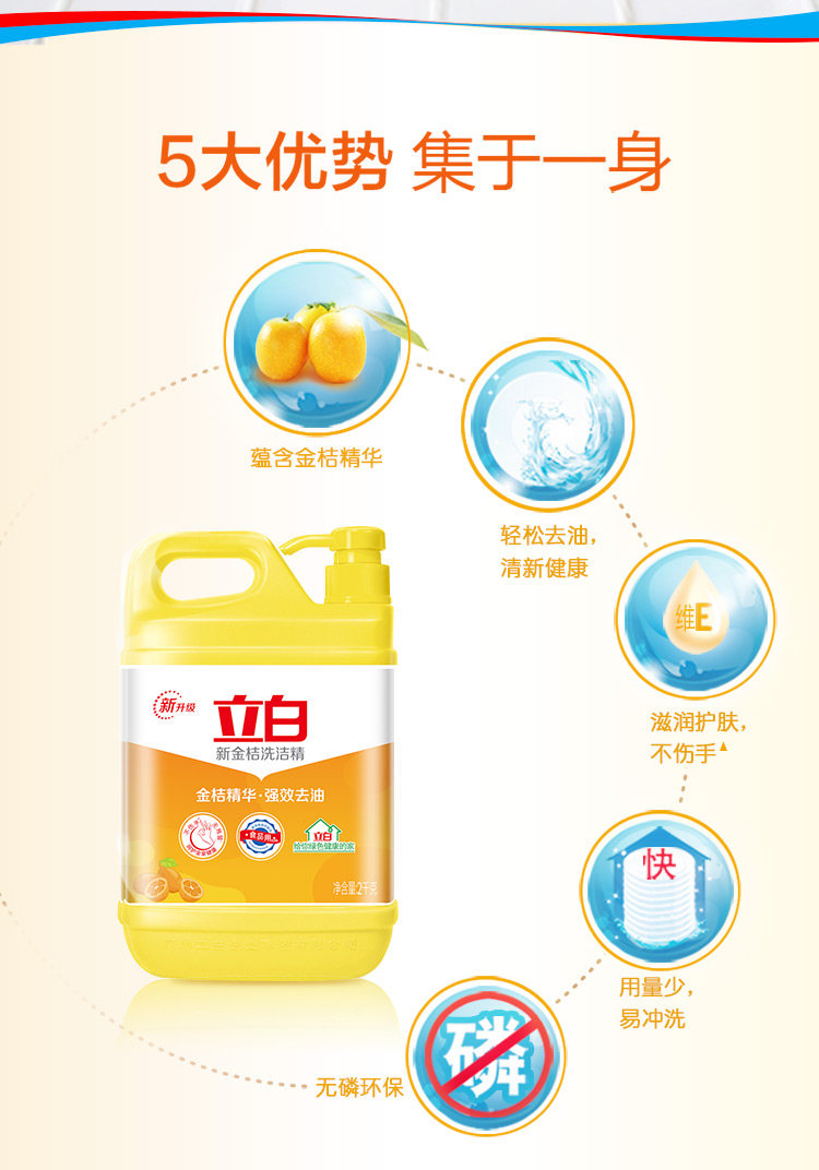 • 商品名称:立白新金桔大桶洗洁精2kgA类食品用除味去油腥餐具洗碗液洗涤灵洗涤剂 洗洁精/瓶