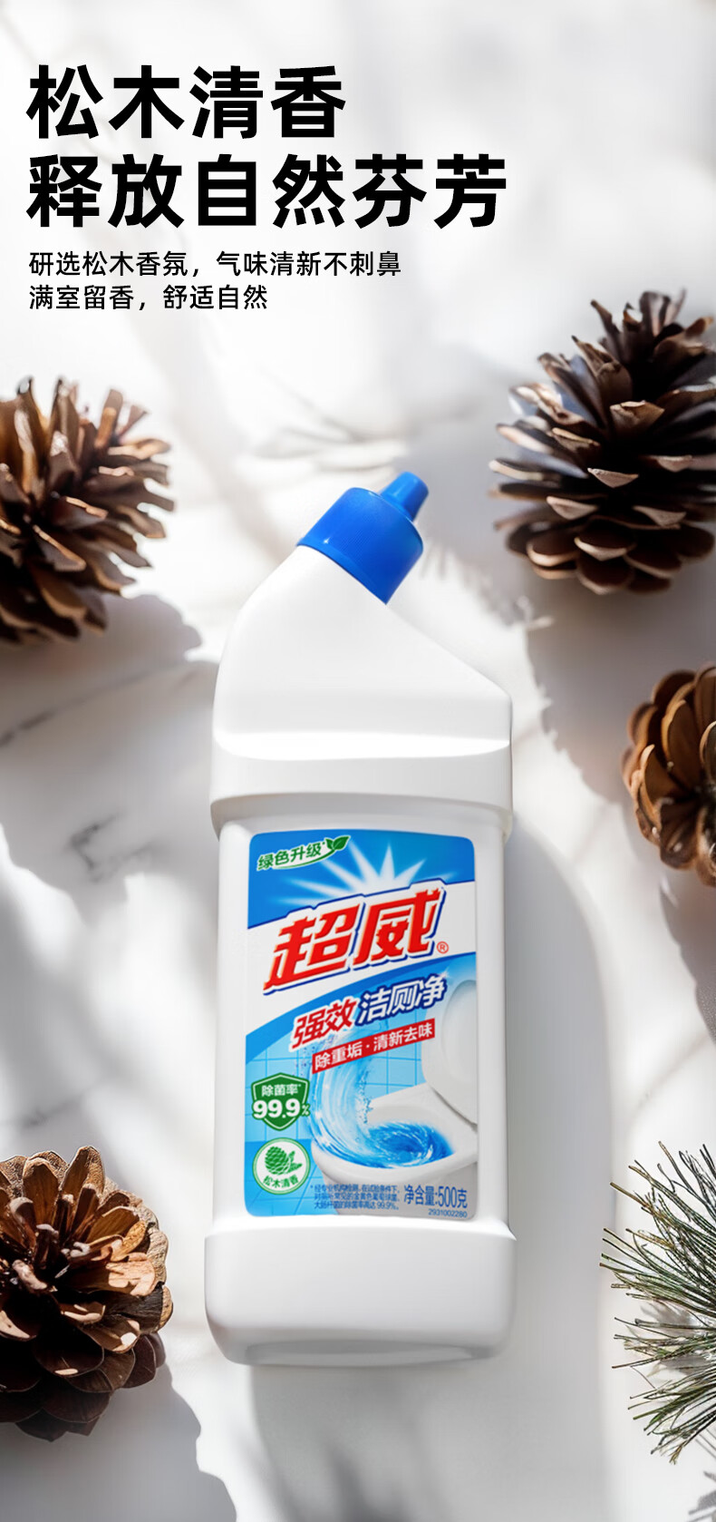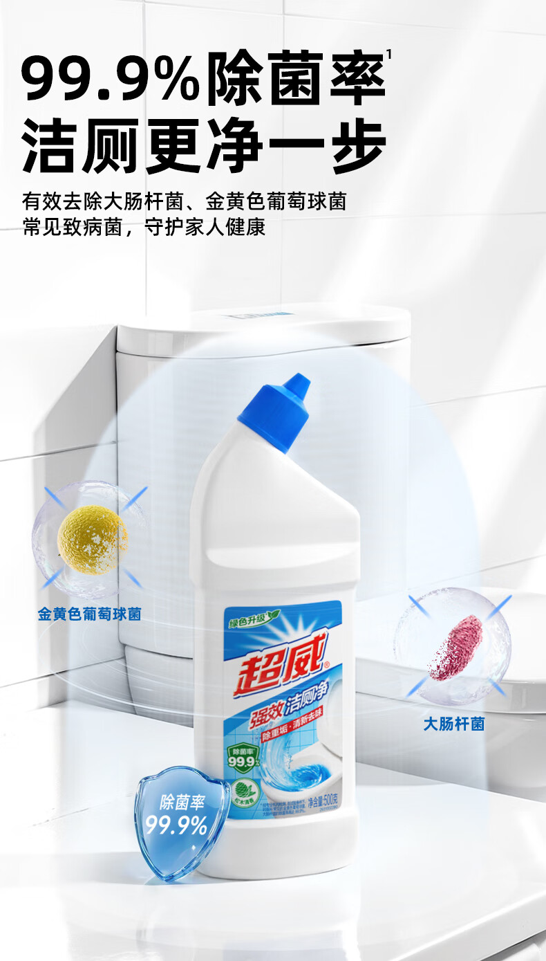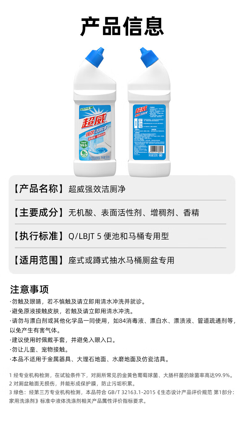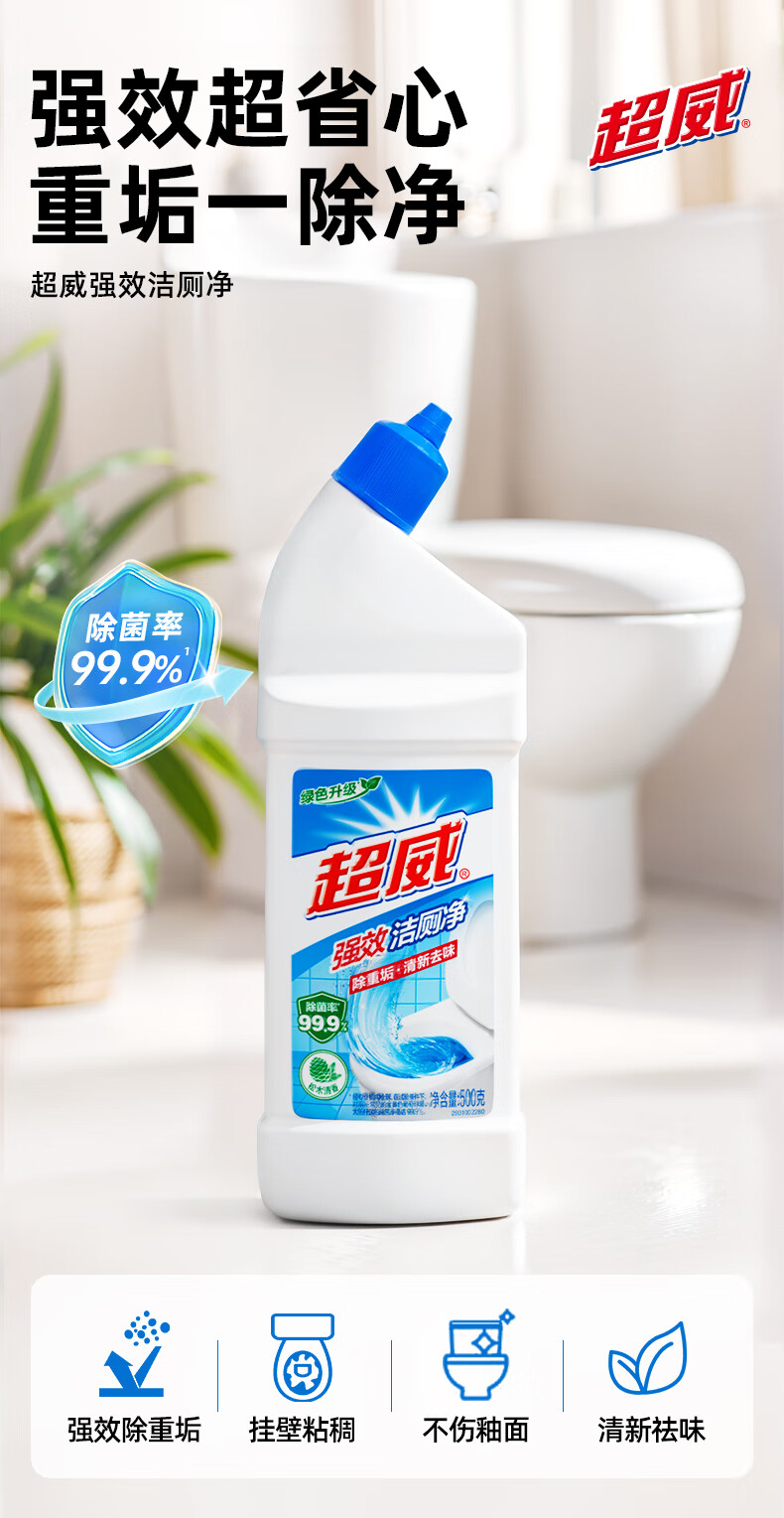 • 商品名称:超威强效洁厕灵 500g*4瓶 马桶厕所清洁剂 松木清香洁厕液 家庭清洁 洁厕剂/件
