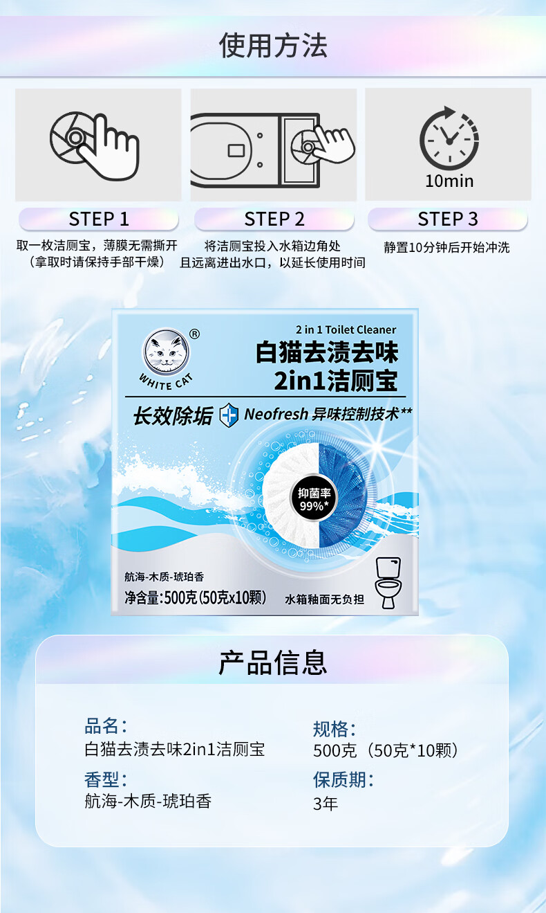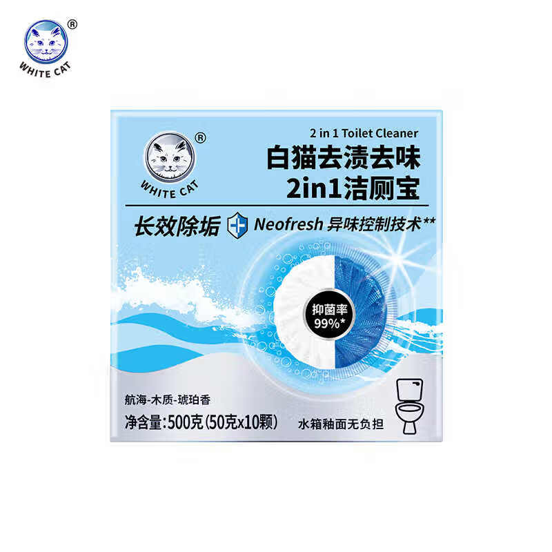 • 商品名称:白猫去渍去味2in1洁厕宝50g*10 50g/盒