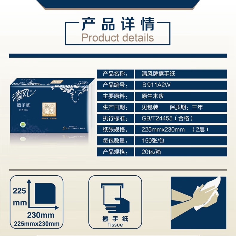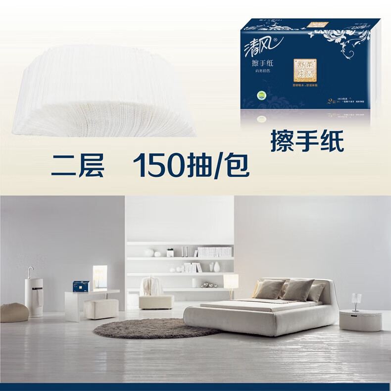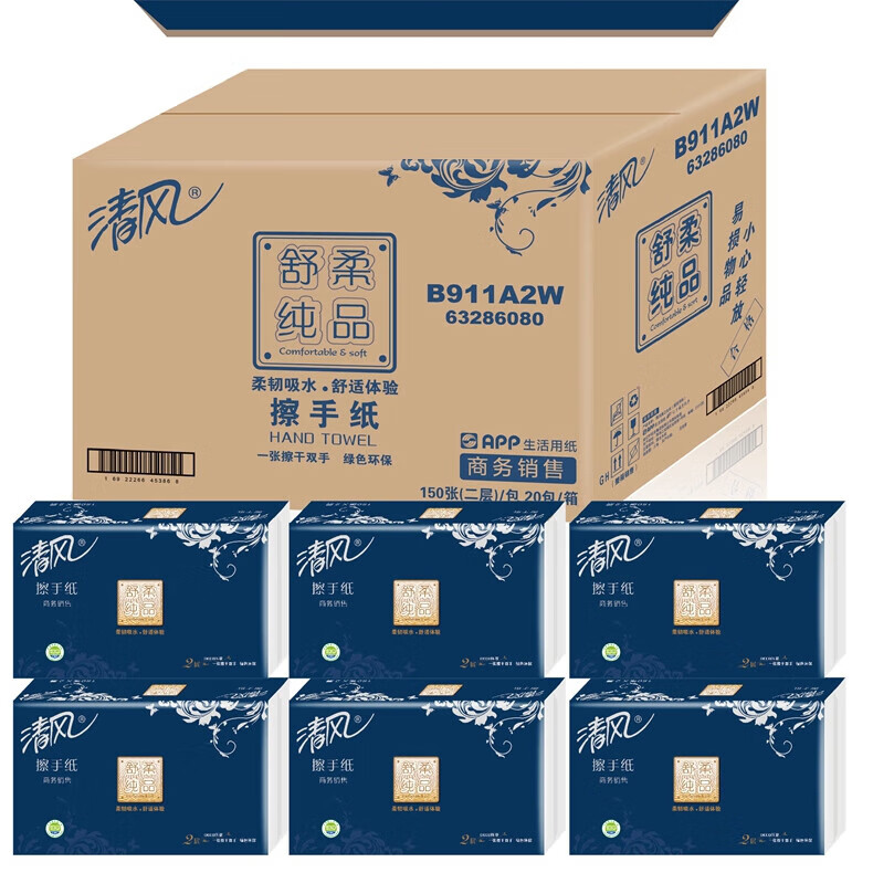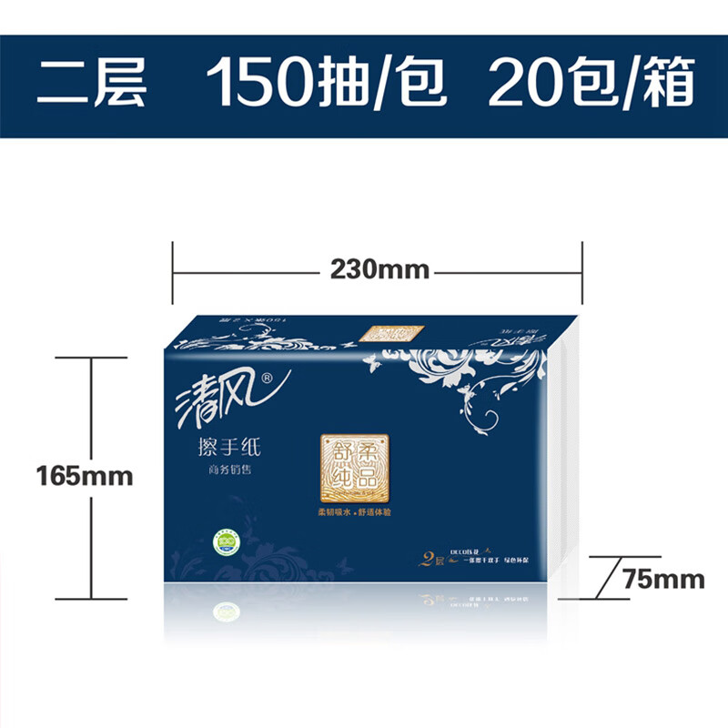 • 商品名称:清风B911A2W舒柔纯品双层酒店物业商用家用擦手纸抽纸150抽*20包/箱 B911A2W/箱