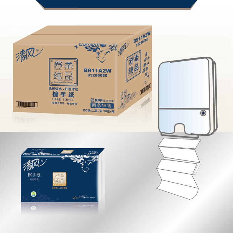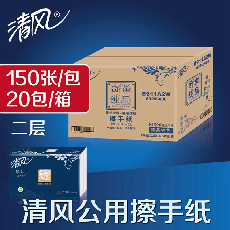 家庭清洁/纸品  > 清洁纸品  > 抽纸  >  清风  >  清风B911A2W舒柔纯品双层酒店物业商用家用擦手纸抽纸150抽*20包/箱 B911A2W/箱