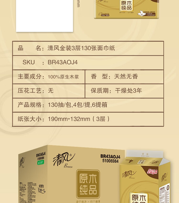 家庭清洁/纸品  > 清洁纸品  > 抽纸  >  清风  >  清风清风纸巾原木金装抽纸3层130抽纸巾24包整箱批发(20 箱) BR43A0J4/箱