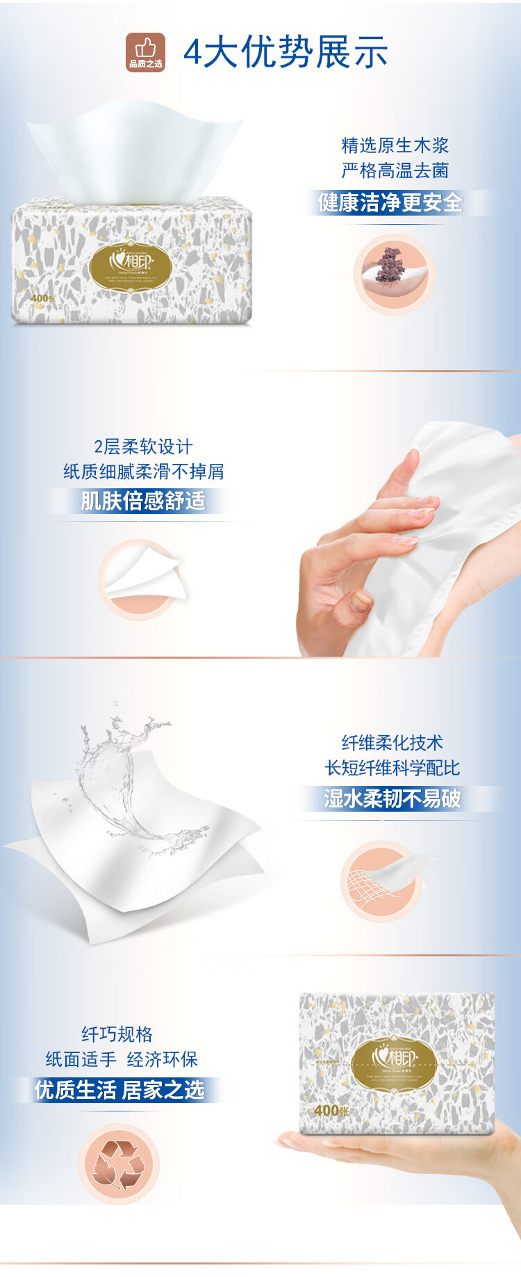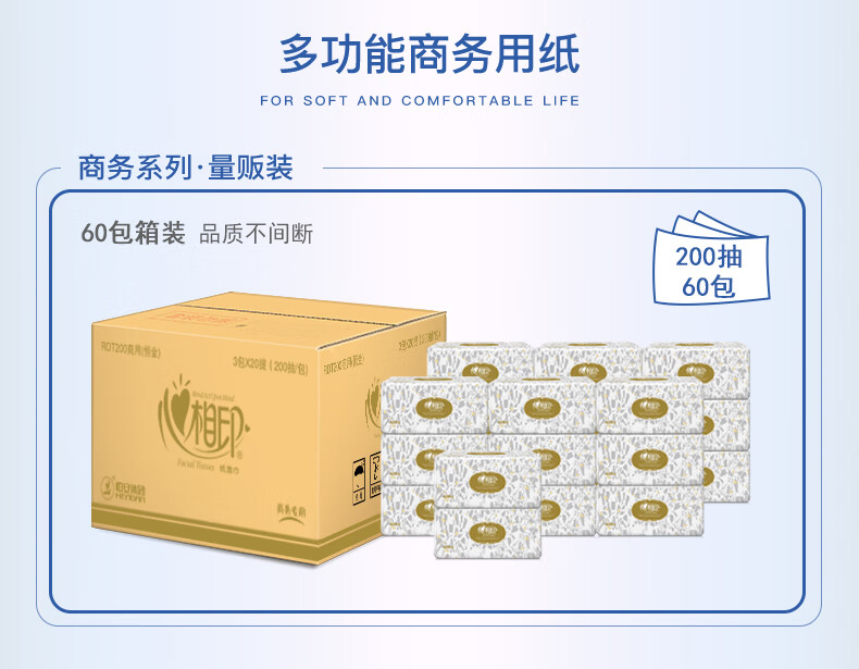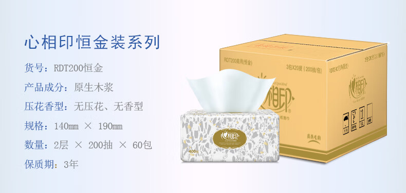 • 商品名称:心相印 商用恒金塑装纸面巾200抽*60包 RDT200(箱装) RDT200/包