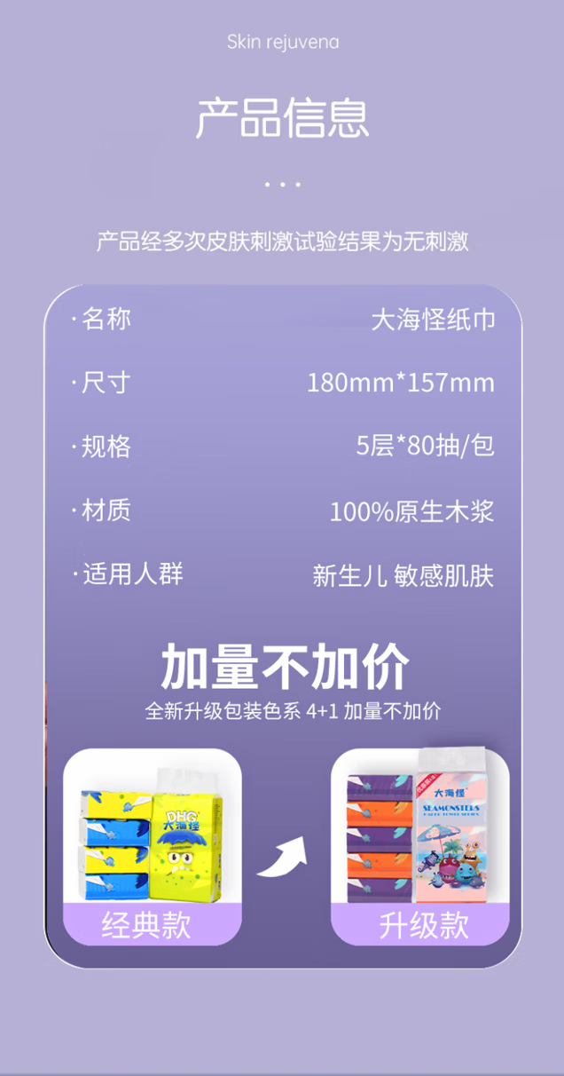 • 商品名称:大海怪5包装L码 157*180mm 5层(80抽) "157*180mm 5层(80抽)/提