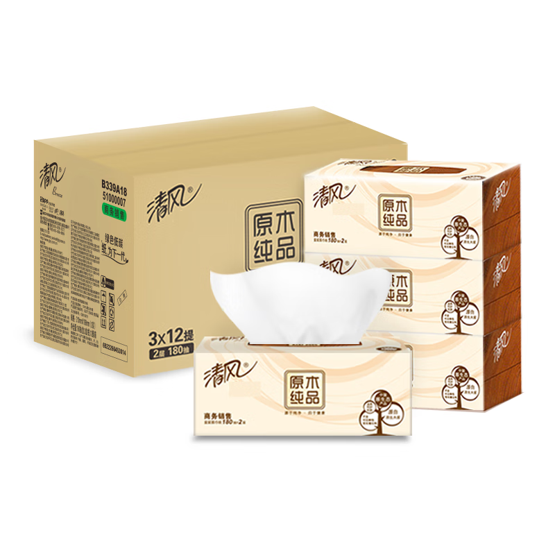 家庭清洁/纸品  > 清洁纸品  > 抽纸  >  清风  >  清风纸巾盒装36包双层180抽商用客房整箱抽纸批发B339A18(单位:箱) B339A18/箱