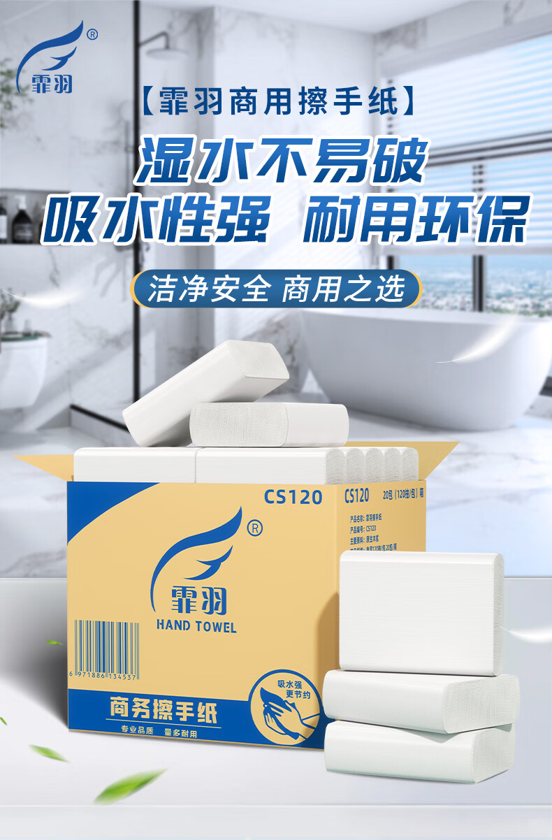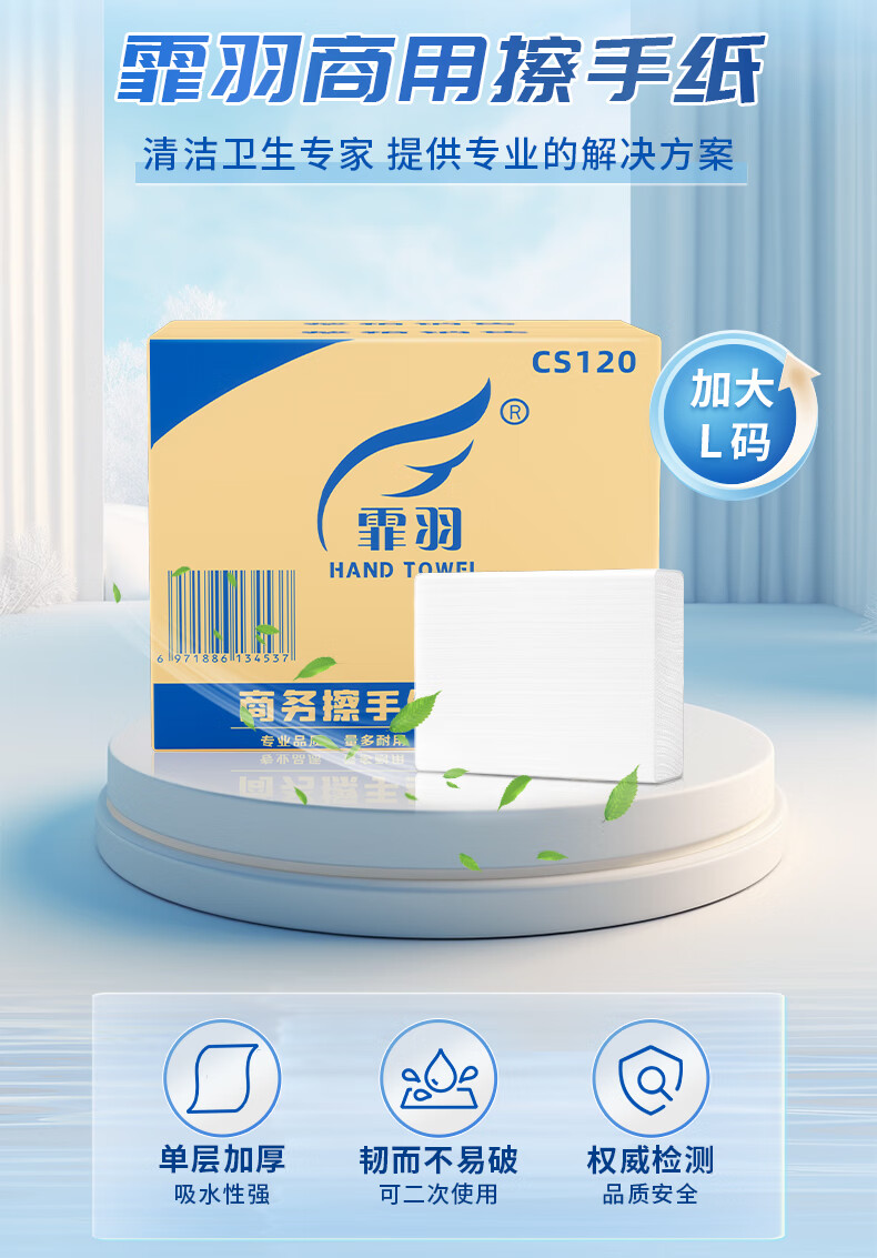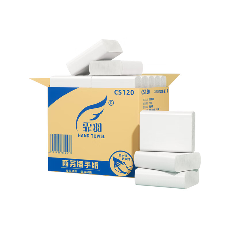 家庭清洁/纸品  > 清洁纸品  > 抽纸  >  霏羽  >  霏羽商用商务擦手纸 1层120抽*20包L码吸水吸油整箱干手抹手纸CS120 CS120/箱