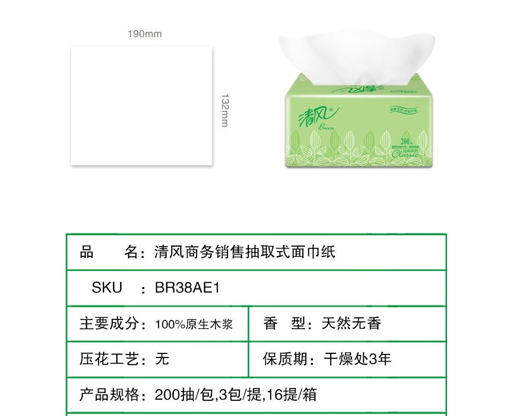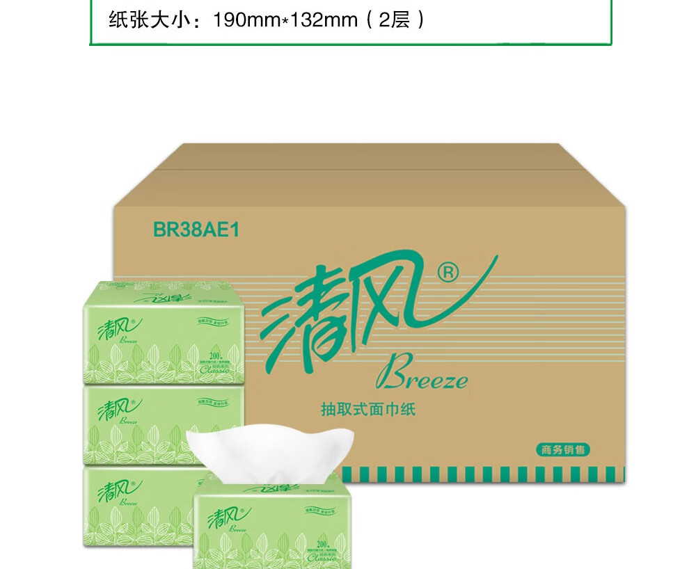 商品名称: 清风抽纸48包双层200抽 商用家用餐厅用纸整箱BR38AE1 BR38AE1/箱