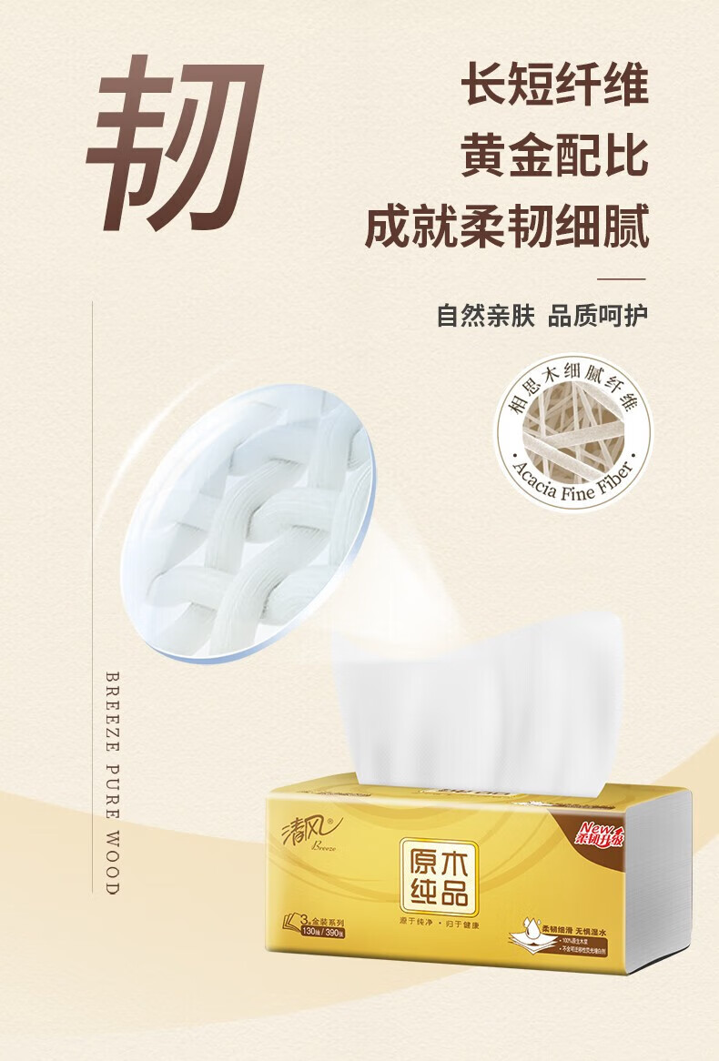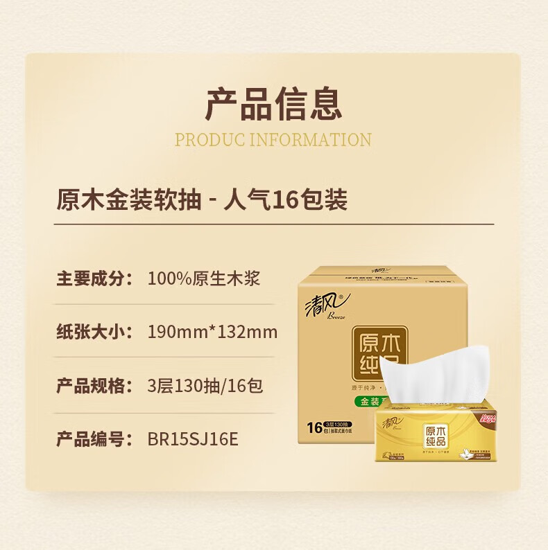 商品名称: 清风 原木金装3层130抽16包S码纸巾面巾纸餐巾纸抽纸擦手纸整箱装 原木金装3层130抽16包_S/箱