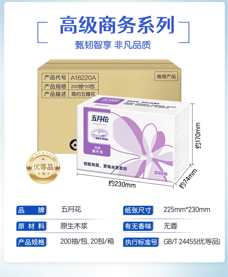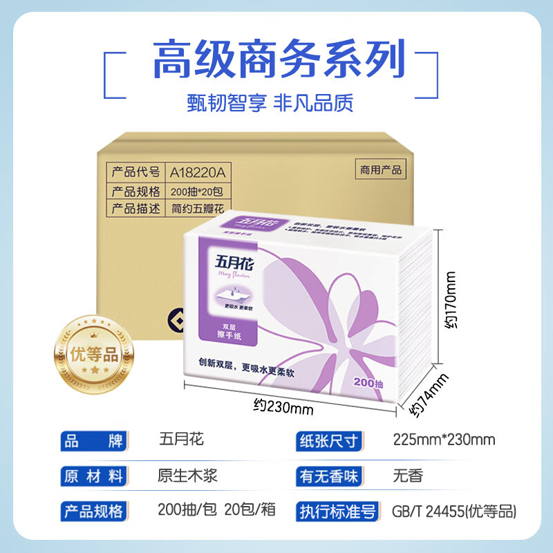 • 商品名称:五月花(May Flower)擦手纸 2层200抽*20包 商务用纸酒店卫生间纸巾 整箱装 优等品擦手纸/箱