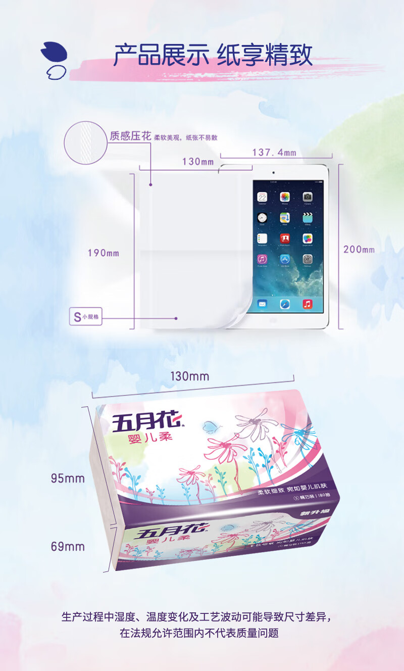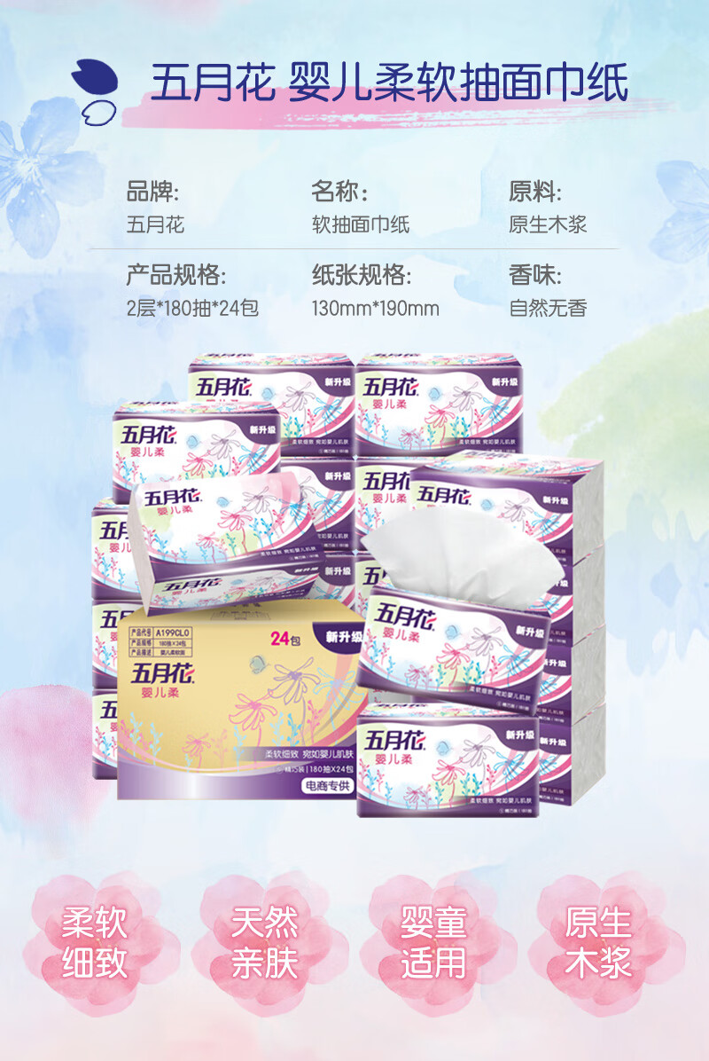 • 商品名称:五月花(May Flower)抽纸 2层180抽*24包S码软抽 柔软亲肤面巾纸 整箱装 柔软亲肤抽纸/箱