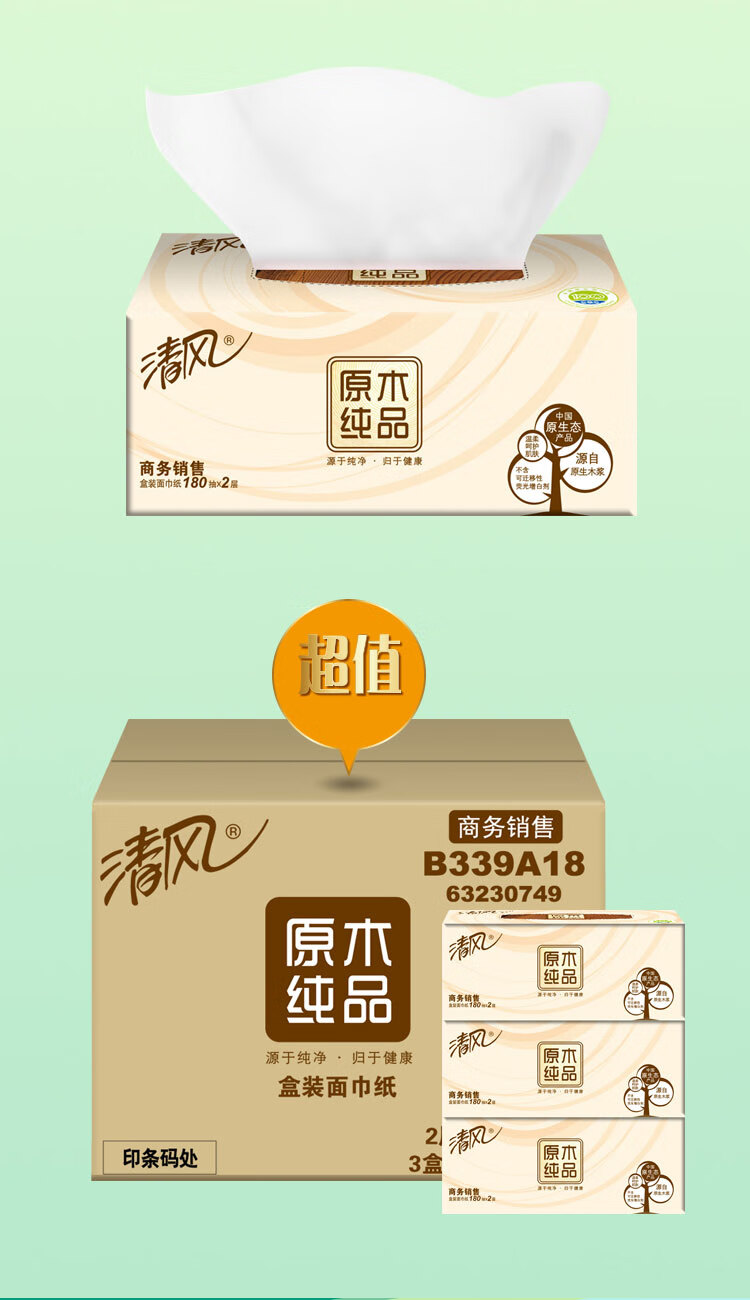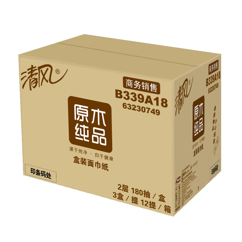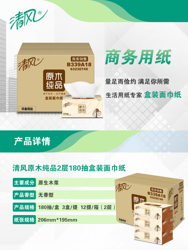 商品名称: 清风抽纸 擦手纸2层180抽*36盒L码 盒抽 餐巾纸 酒店商务商用 整箱 B339A18/箱