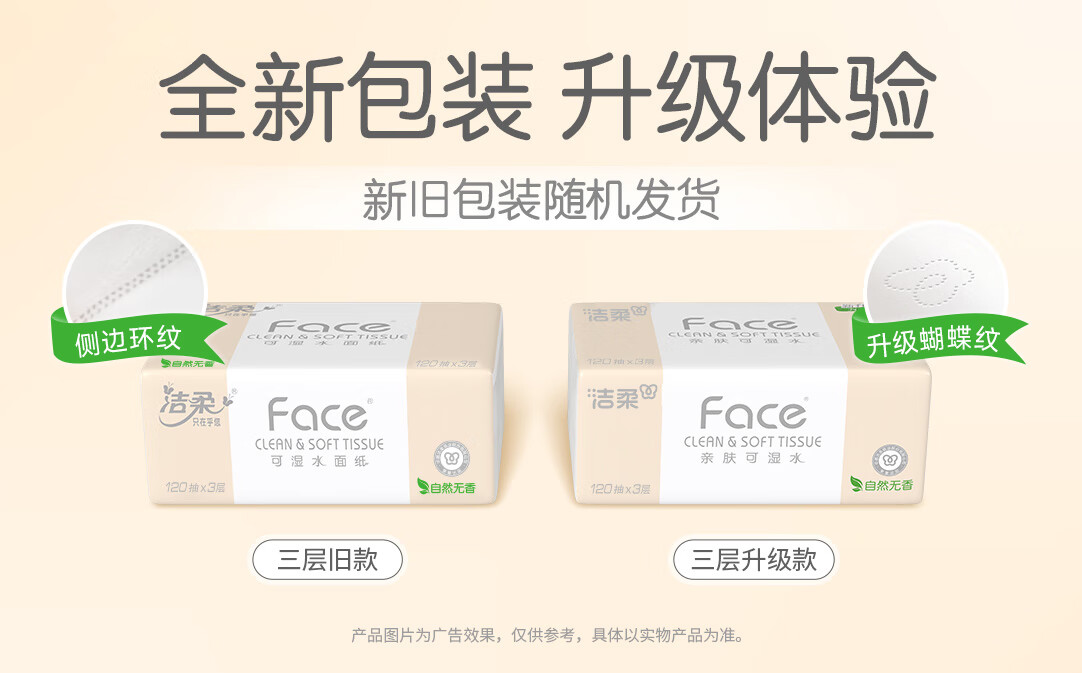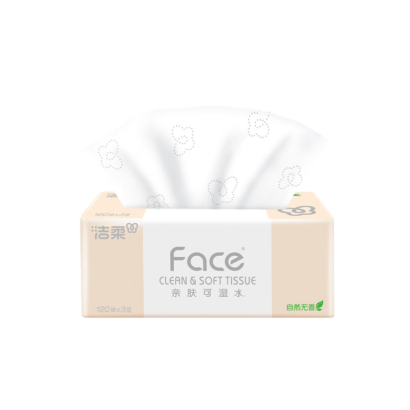家庭清洁/纸品  > 清洁纸品  > 抽纸  >  洁柔  >  洁柔抽纸 粉Face柔韧3层120抽*8包 可湿水面巾纸纸巾 湿水强韧 抽纸/提