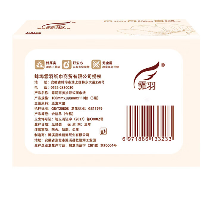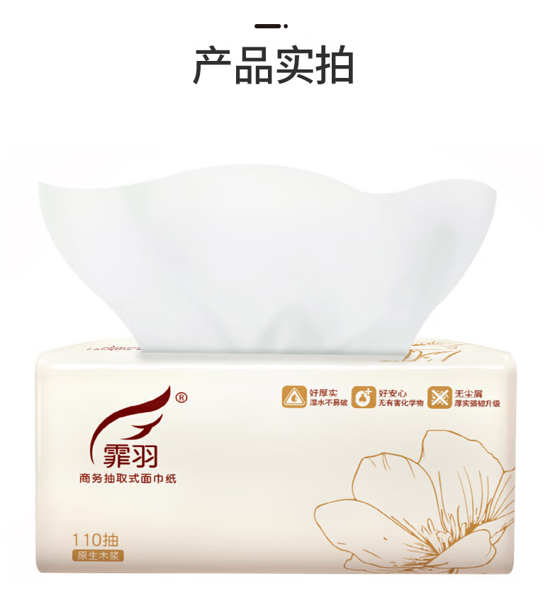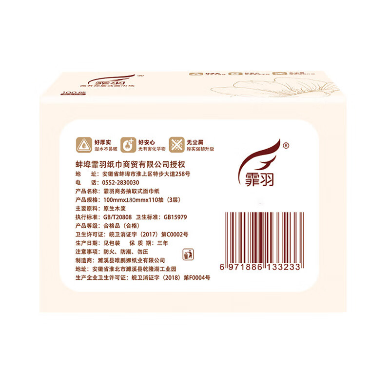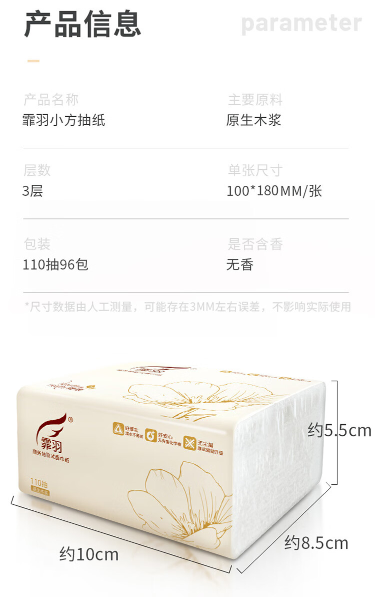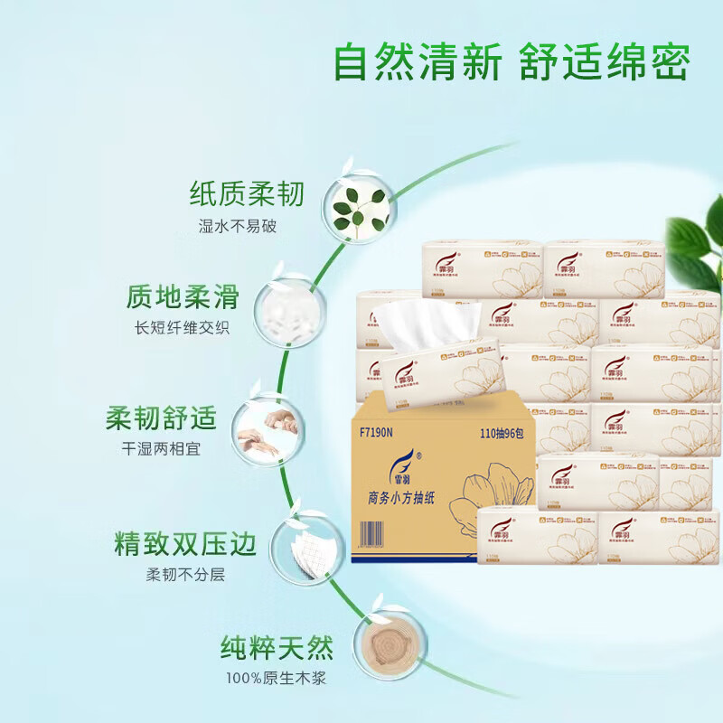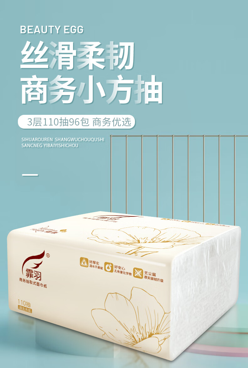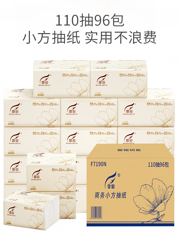 • 商品名称:霏羽小方抽纸3层110抽96包方巾纸饭店餐巾纸F7190N【企业专属】 抽纸/箱