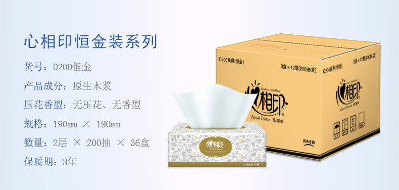 家庭清洁/纸品  > 清洁纸品  > 抽纸  >  心相印  >  心相印 商用金色盒装2层200抽纸面巾(36盒)D200(箱装) D200/包