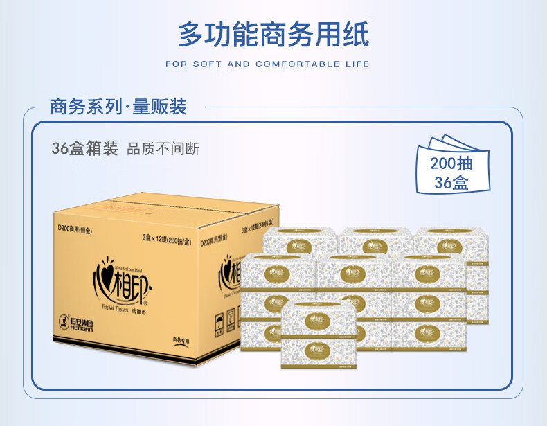 • 商品名称:心相印 商用金色盒装2层200抽纸面巾(36盒)D200(箱装) D200/包