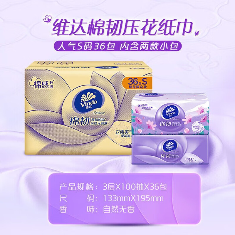 商品名称: 维达(Vinda)抽纸【孙颖莎推荐】棉韧3层100抽*36包S码 亲肤无刺激纸巾 AB混发 V2833-D/箱