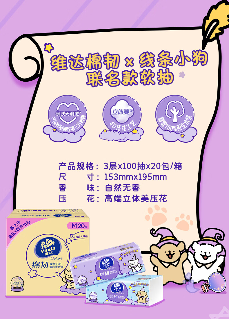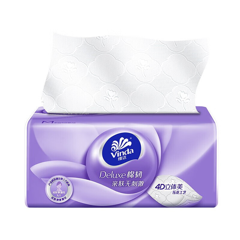 家庭清洁/纸品  > 清洁纸品  > 抽纸  >  维达/Vinda  >  维达(Vinda)抽纸 棉韧100抽*20包M码 亲肤无刺激 卫生纸纸巾 餐巾纸 整箱 V2880-A/V2880-D/箱