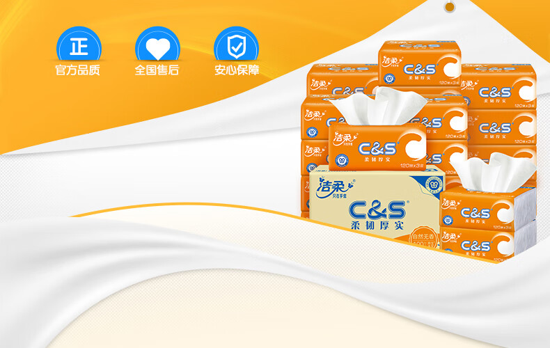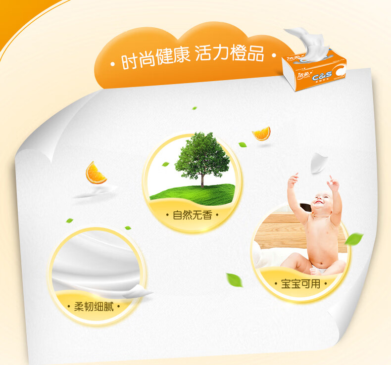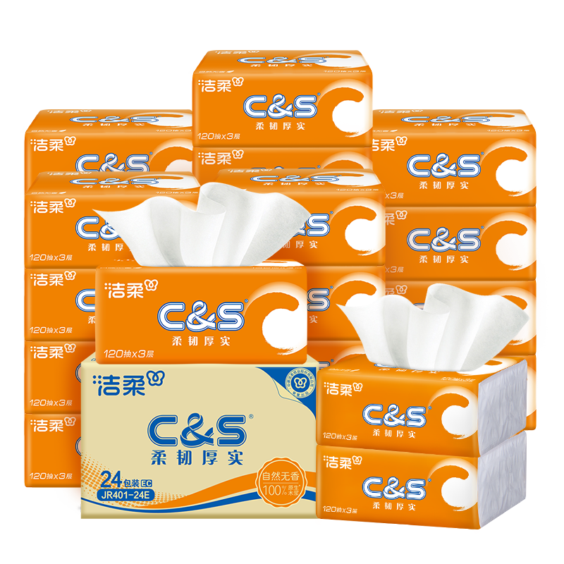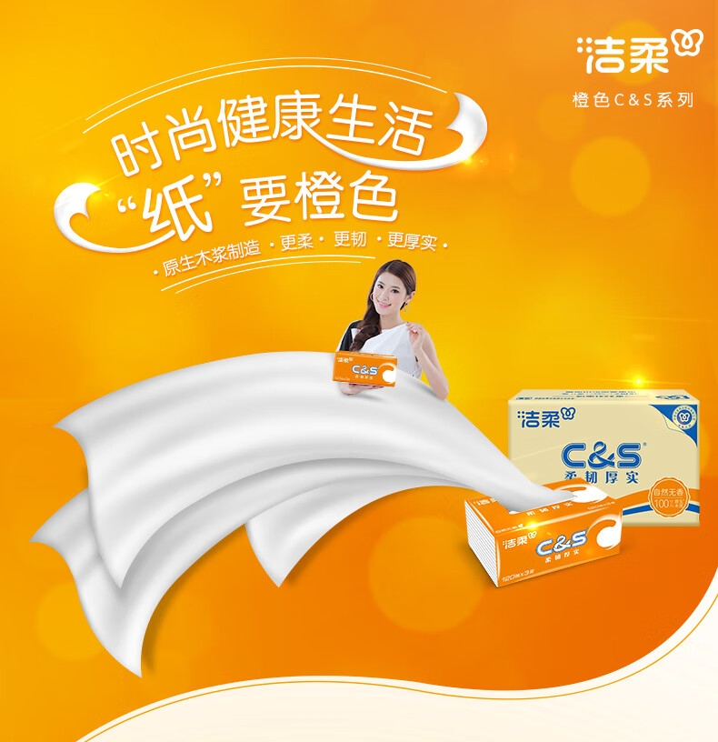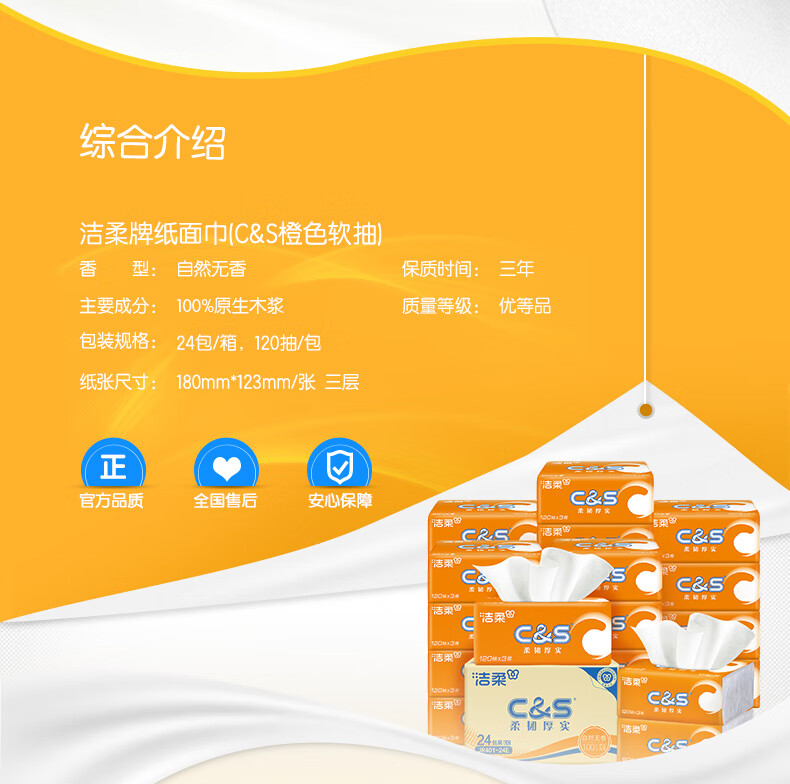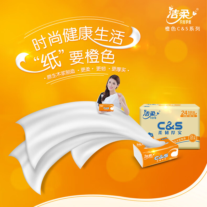 家庭清洁/纸品  > 清洁纸品  > 抽纸  >  洁柔  >  洁柔抽纸 活力阳光橙3层120抽*24包 母婴可用 全家适用 面巾纸 整箱 抽纸/箱