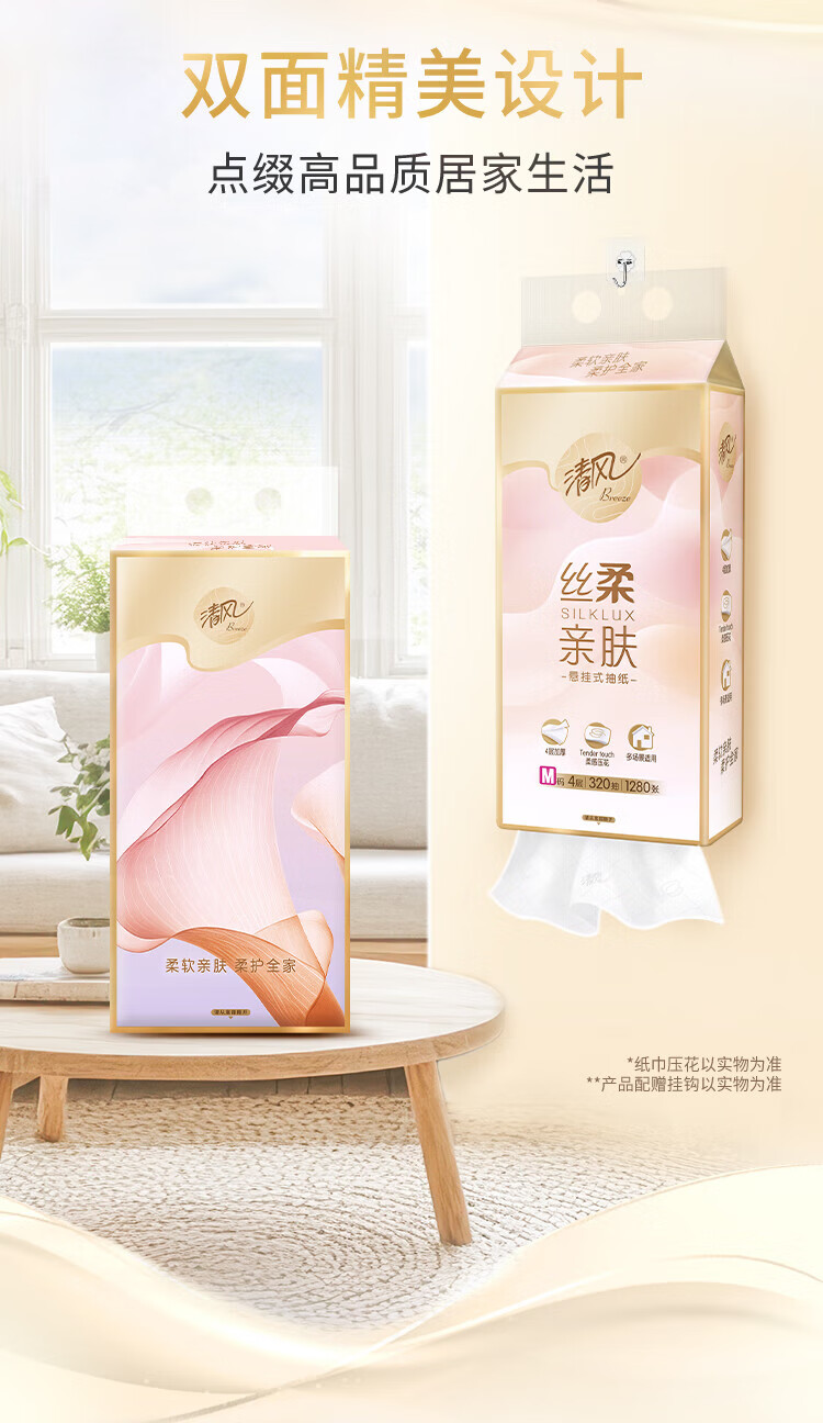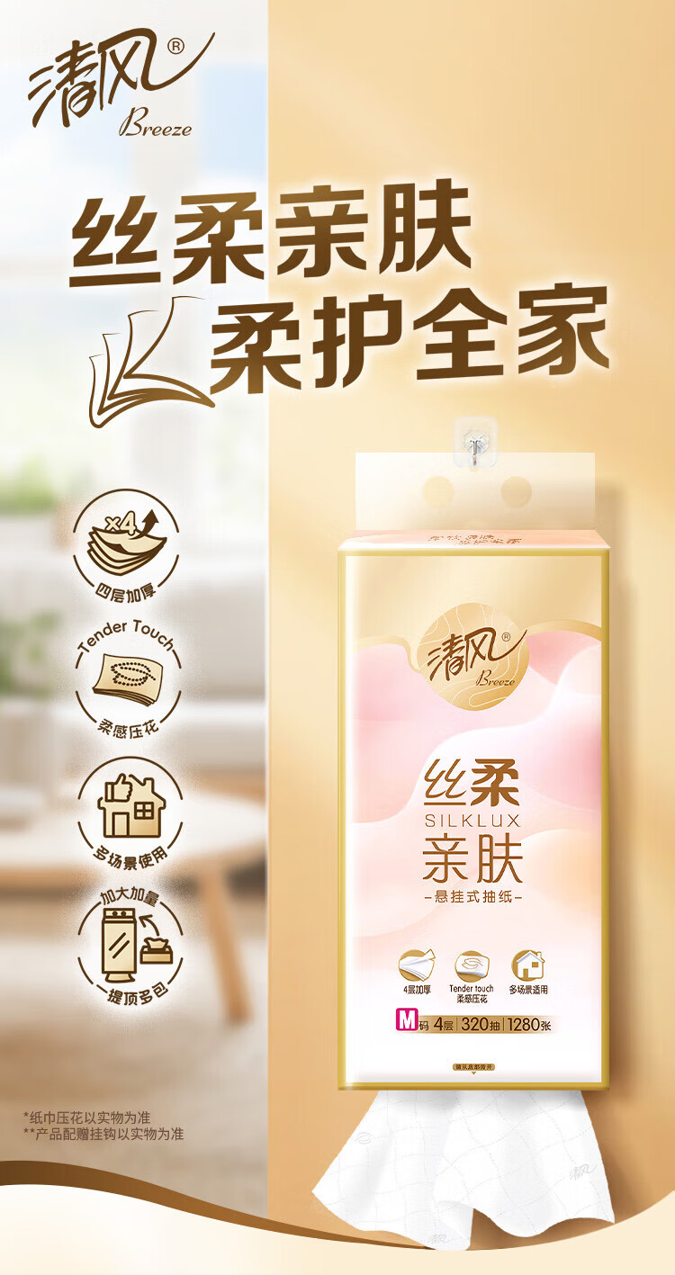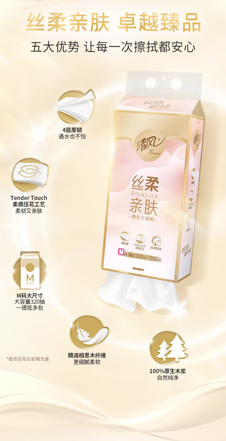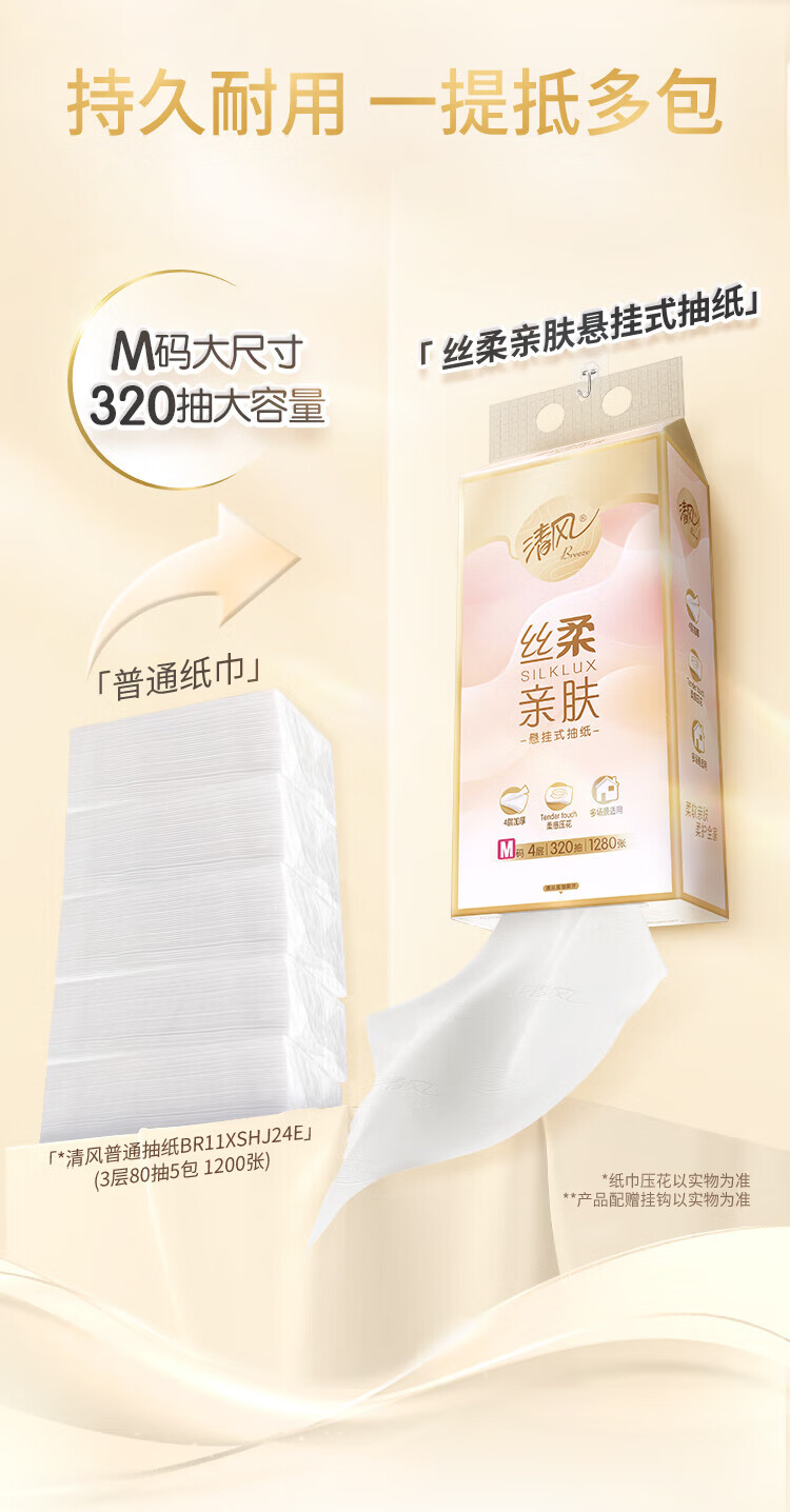 包装清单: 清风丝柔系列4层320抽/包*1挂式抽纸BG32MSBC