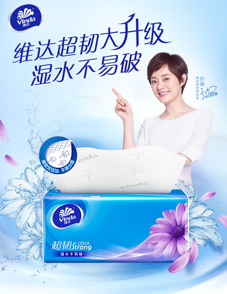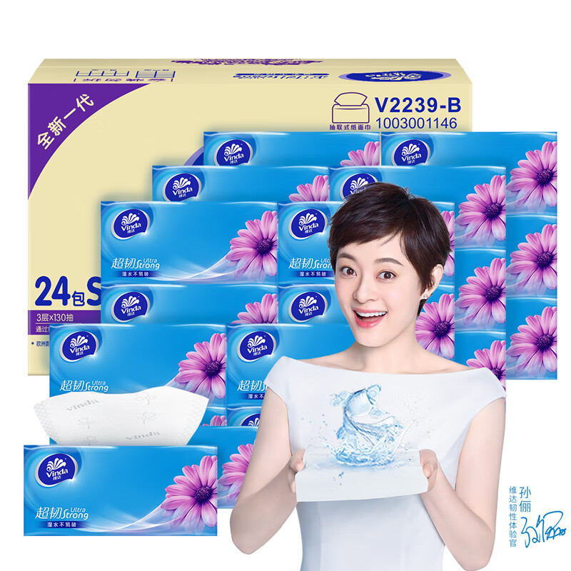 家庭清洁/纸品  > 清洁纸品  > 抽纸  >  维达/Vinda  >  维达(Vinda)超韧3层130抽*24包软抽真S码抽纸整箱销售湿水不易破母婴可用 V2239-B/箱