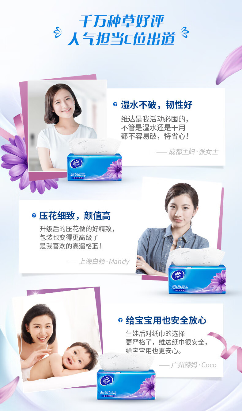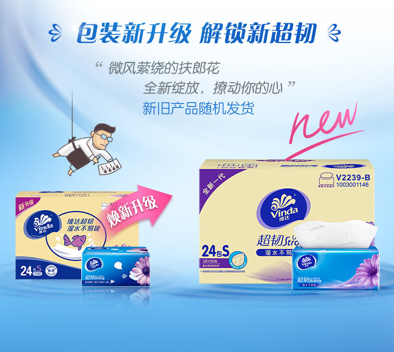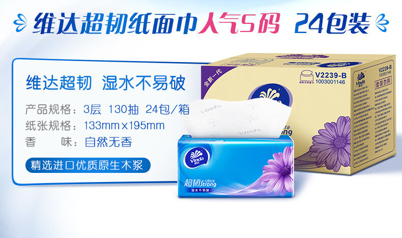 • 商品名称:维达(Vinda)超韧3层130抽*24包软抽真S码抽纸整箱销售湿水不易破母婴可用 V2239-B/箱