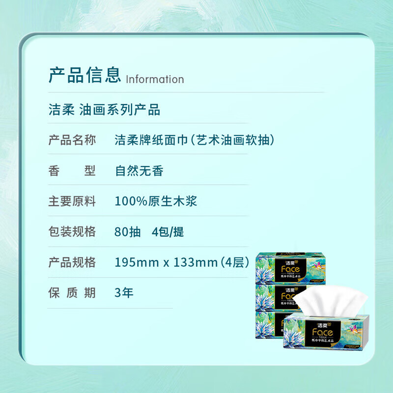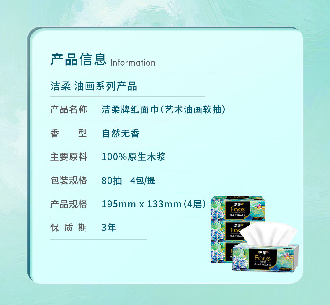 包装清单: 洁柔艺术油画4层80抽4包装BR128-24E