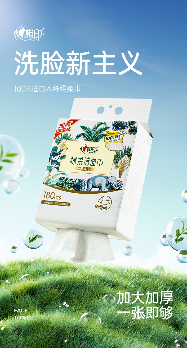 家庭清洁/纸品  > 清洁纸品  > 抽纸  >  心相印  >  心相印洗脸巾棉柔系列180片*1提装悬挂式洁面巾干湿两用纸巾(包邮) XCD180+P1/提