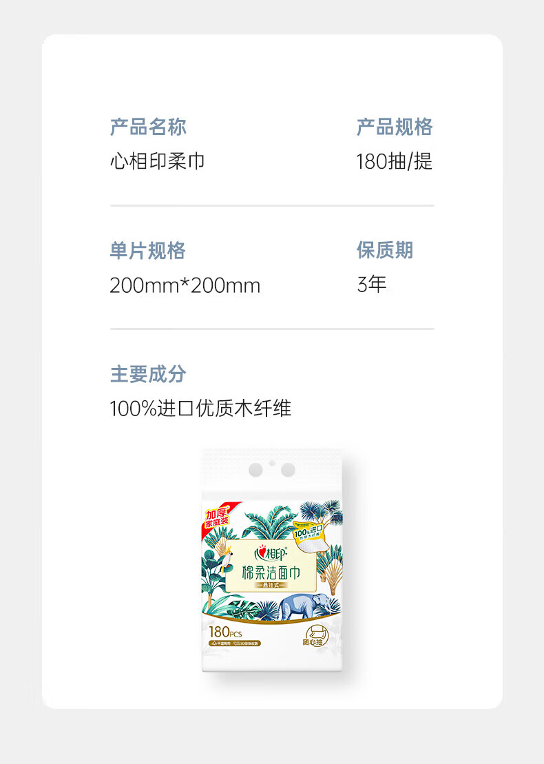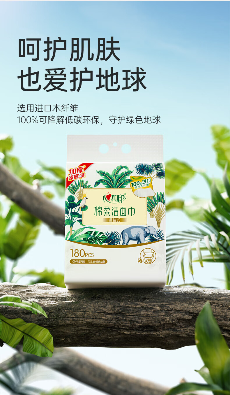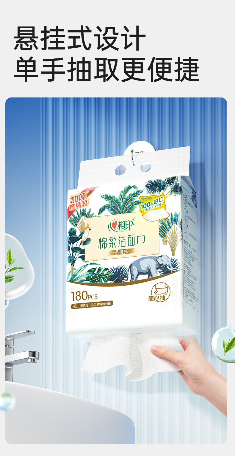 • 商品名称:心相印洗脸巾棉柔系列180片*1提装悬挂式洁面巾干湿两用纸巾(包邮) XCD180+P1/提