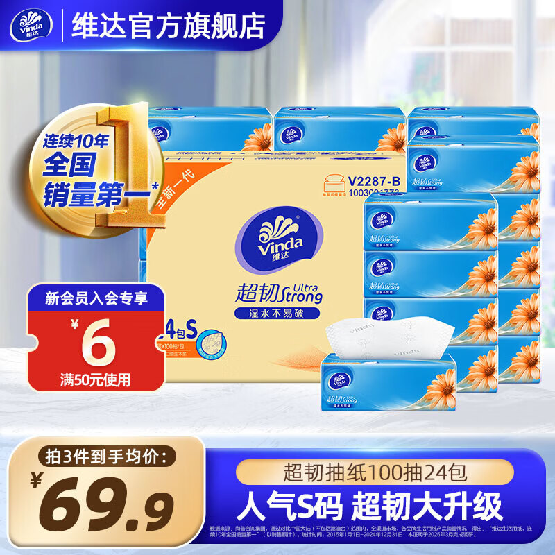 • 商品名称:维达V2287-B 维达100抽3层超韧抽取式纸面巾(1×24)装/箱 1箱 V2287-B/箱
