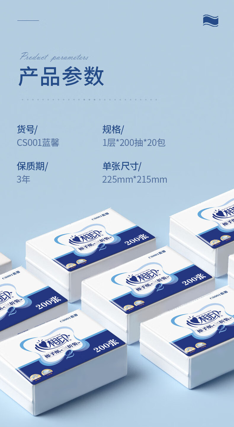 • 商品名称:心相印(Mind Act Upon Mind)擦手纸 CS001商用蓝馨系列1层200抽*20包 写字楼办公酒店专用纸 CS001蓝馨/箱