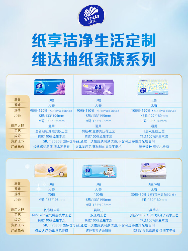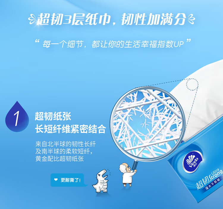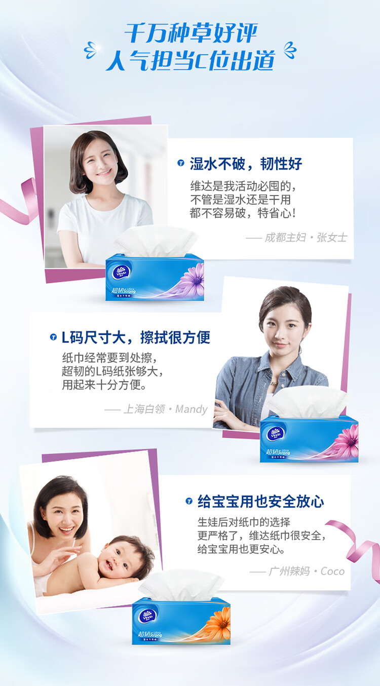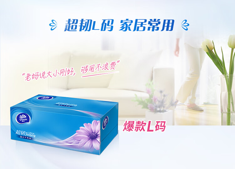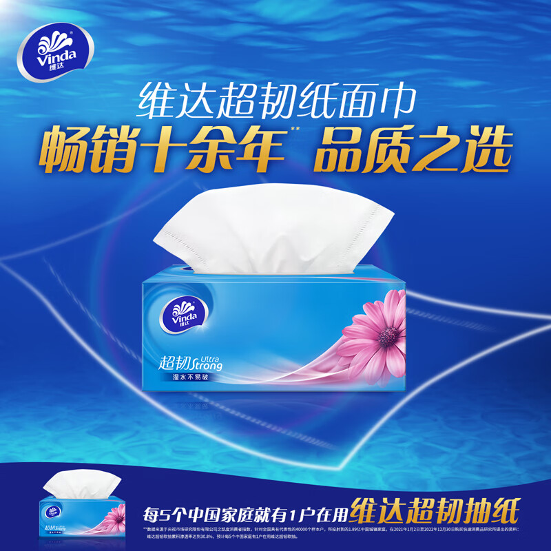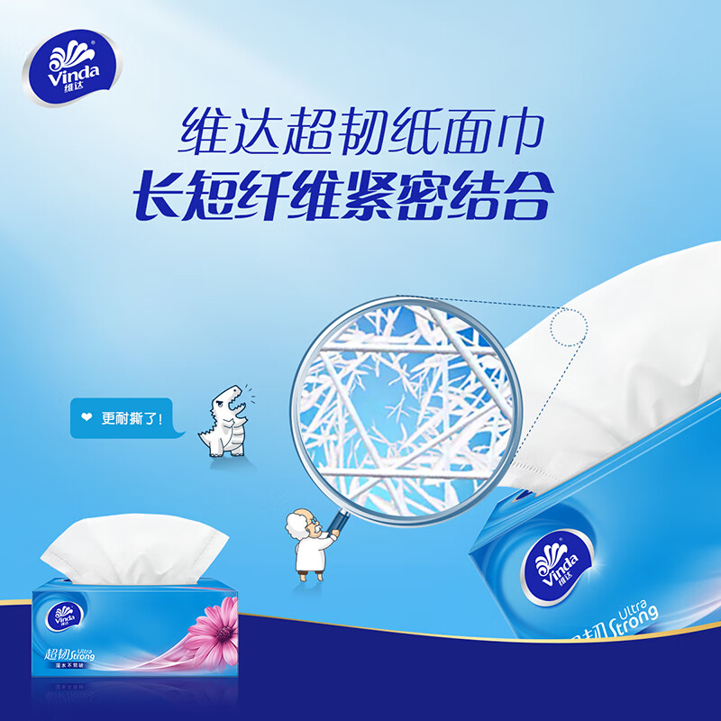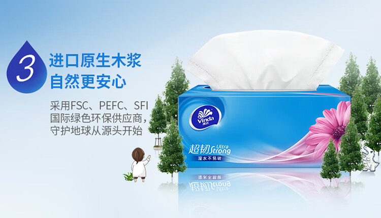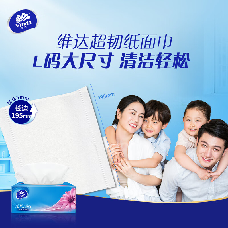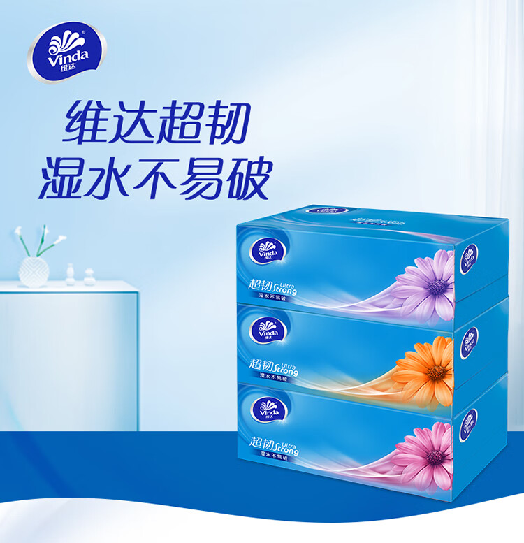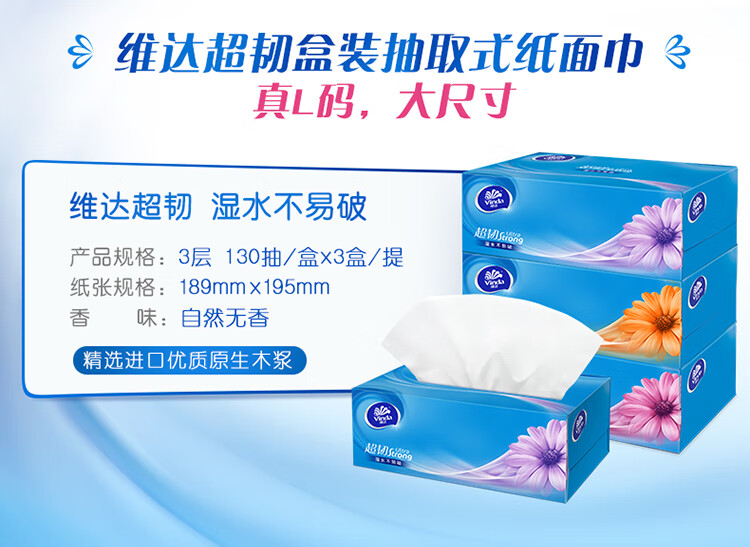 • 商品名称:维达(Vinda)抽纸 超韧3层130抽*3包L码 湿水不易破 盒抽 卫生纸 纸巾 餐巾纸 面巾/提